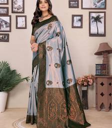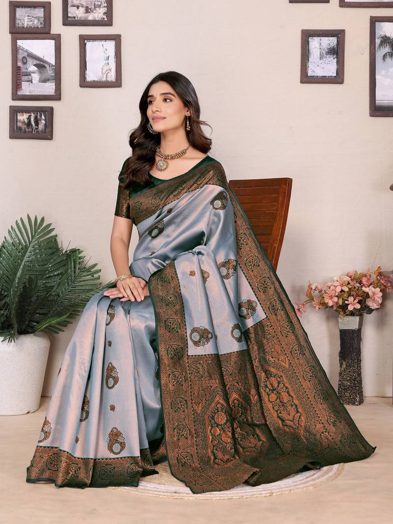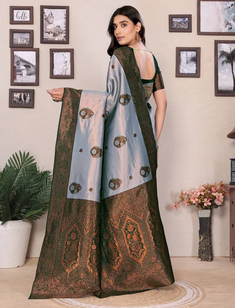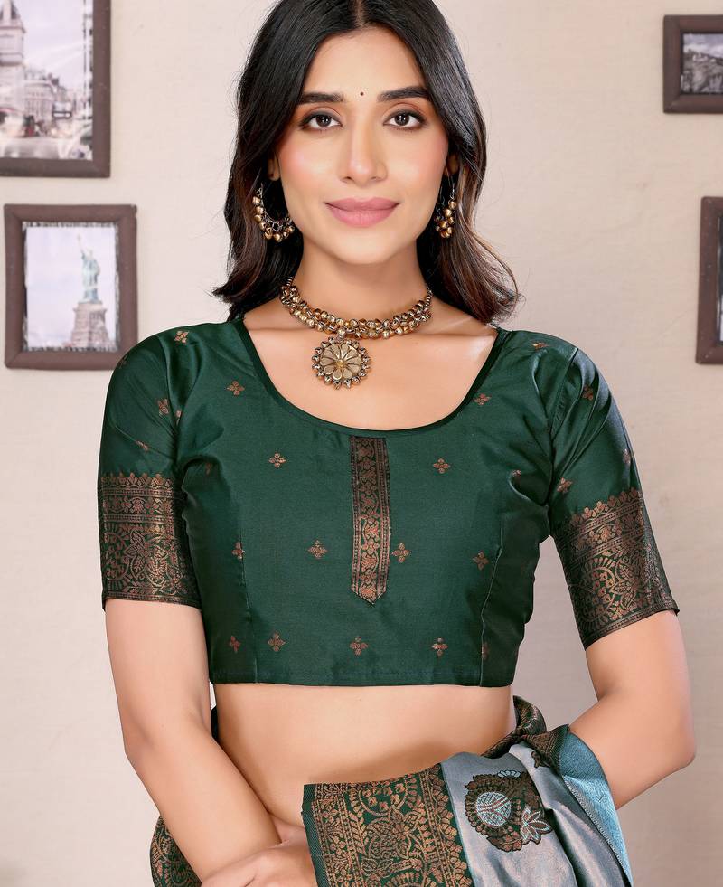 Sea green soft silk blend banarasi jacuard work designer party wear saree with unstitched blouse piece