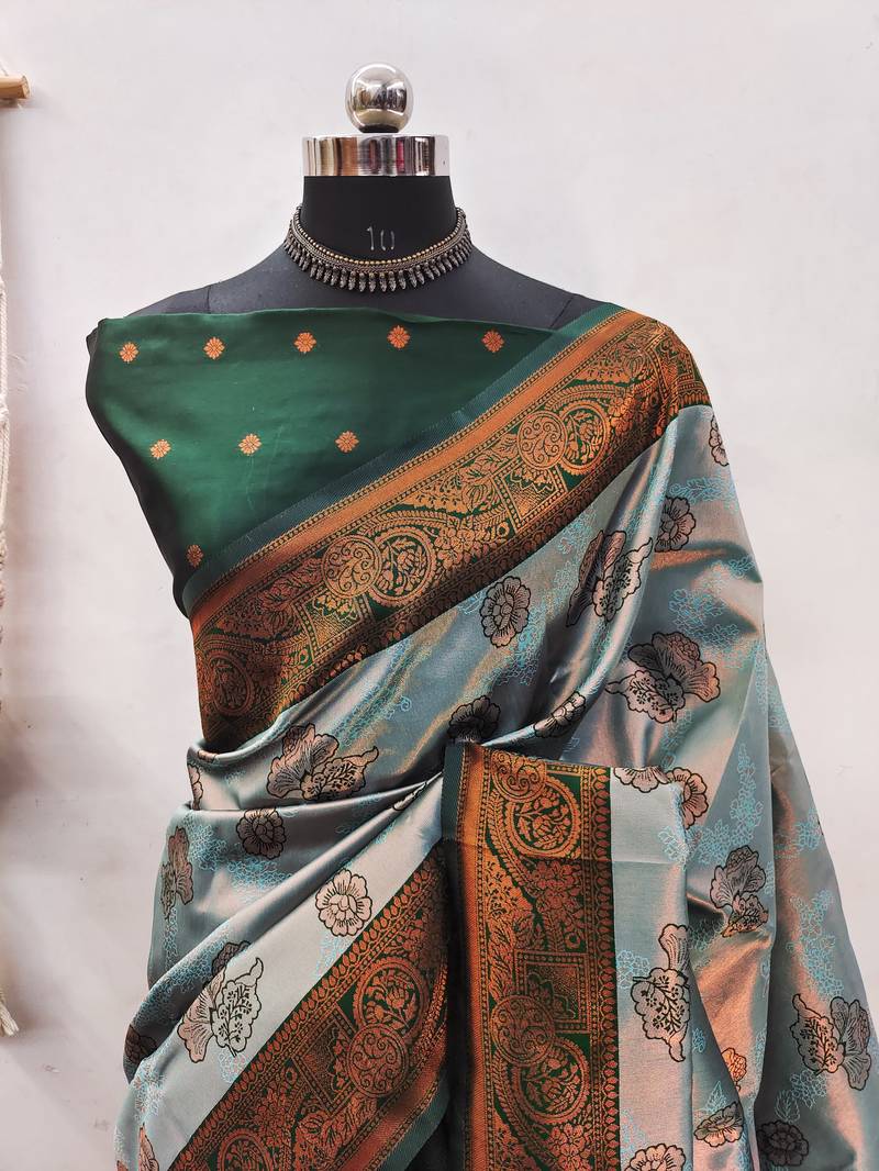 Sea green soft silk blend banarasi jacuard work designer party wear saree with unstitched blouse piece
