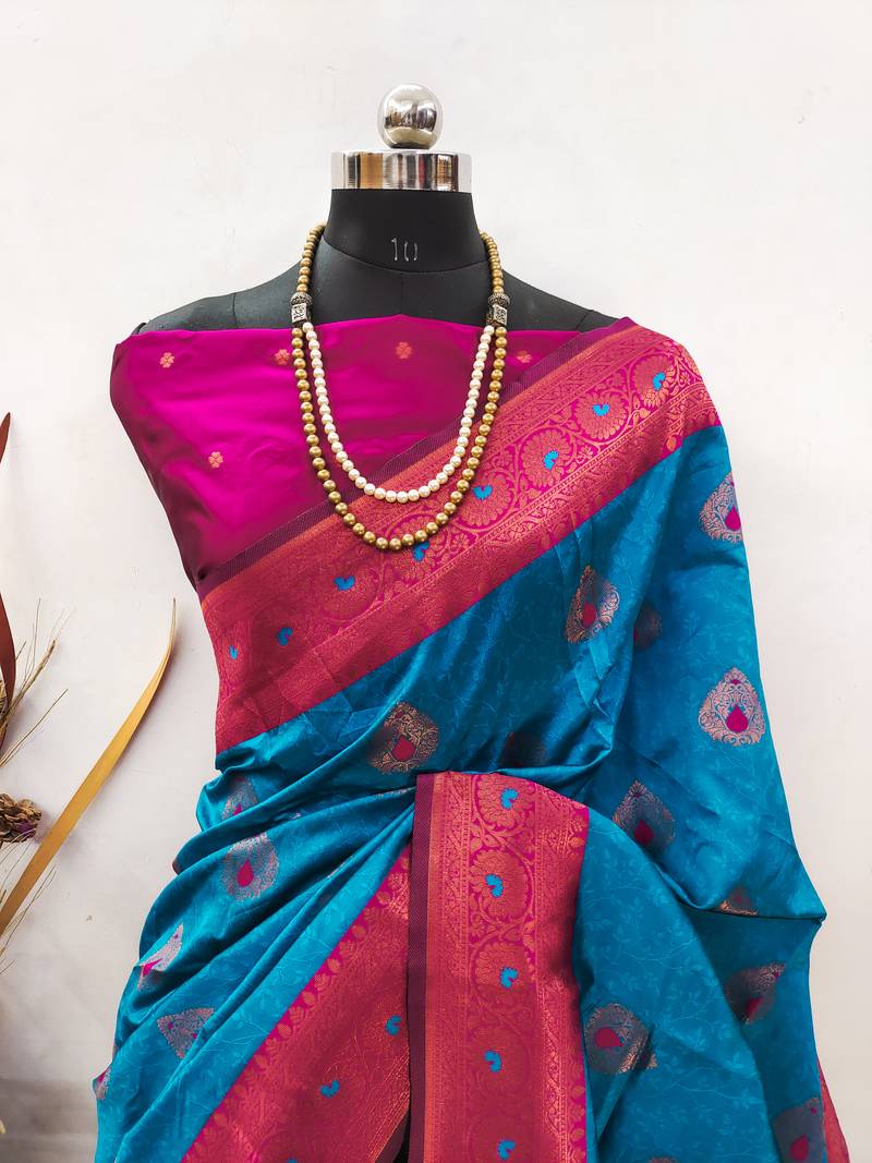 Product Name Sky Blue Pink Soft Silk Blend Banarasi Jacuard Work Designer Party Wear Saree With Unstitched Blouse Piece