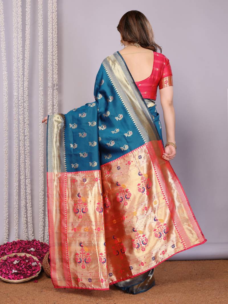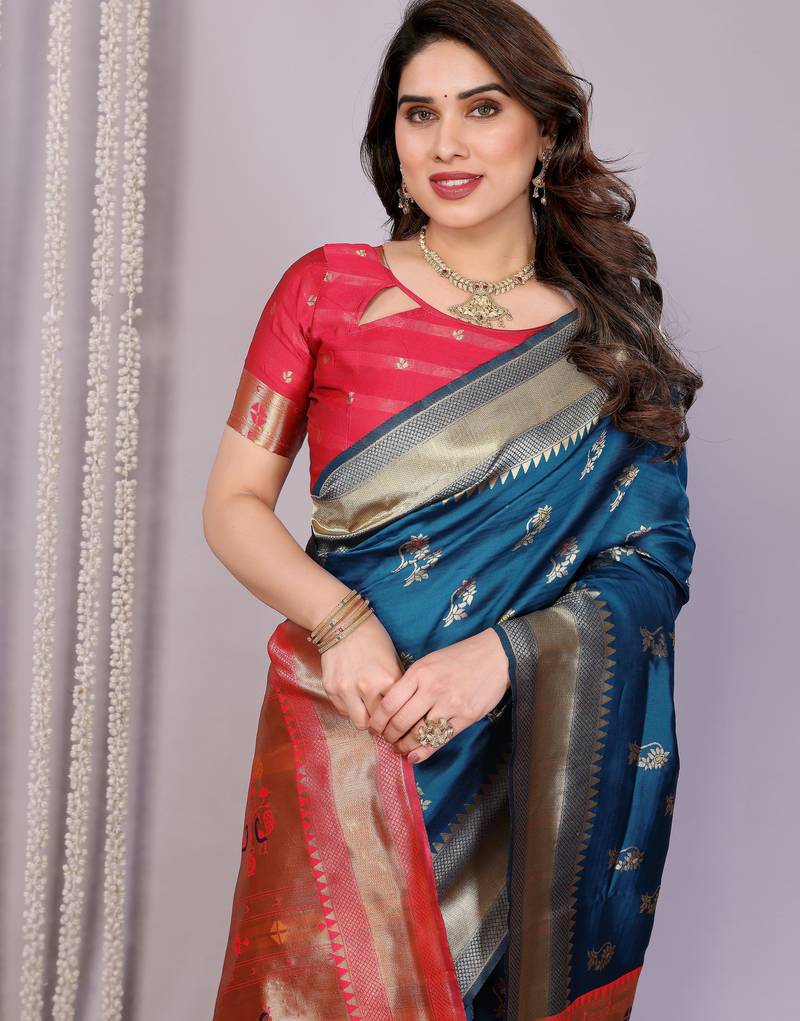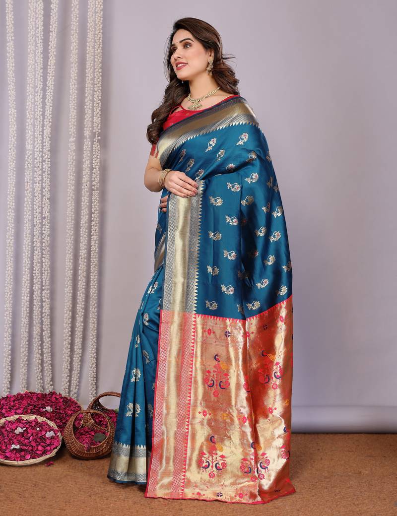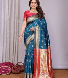 Turquoise soft art silk banarasi saree with blouse