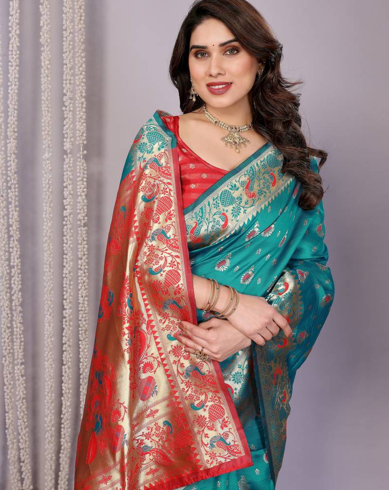 | Product Name | Turquoise Soft Art Silk Banarasi Saree With Blouse | |