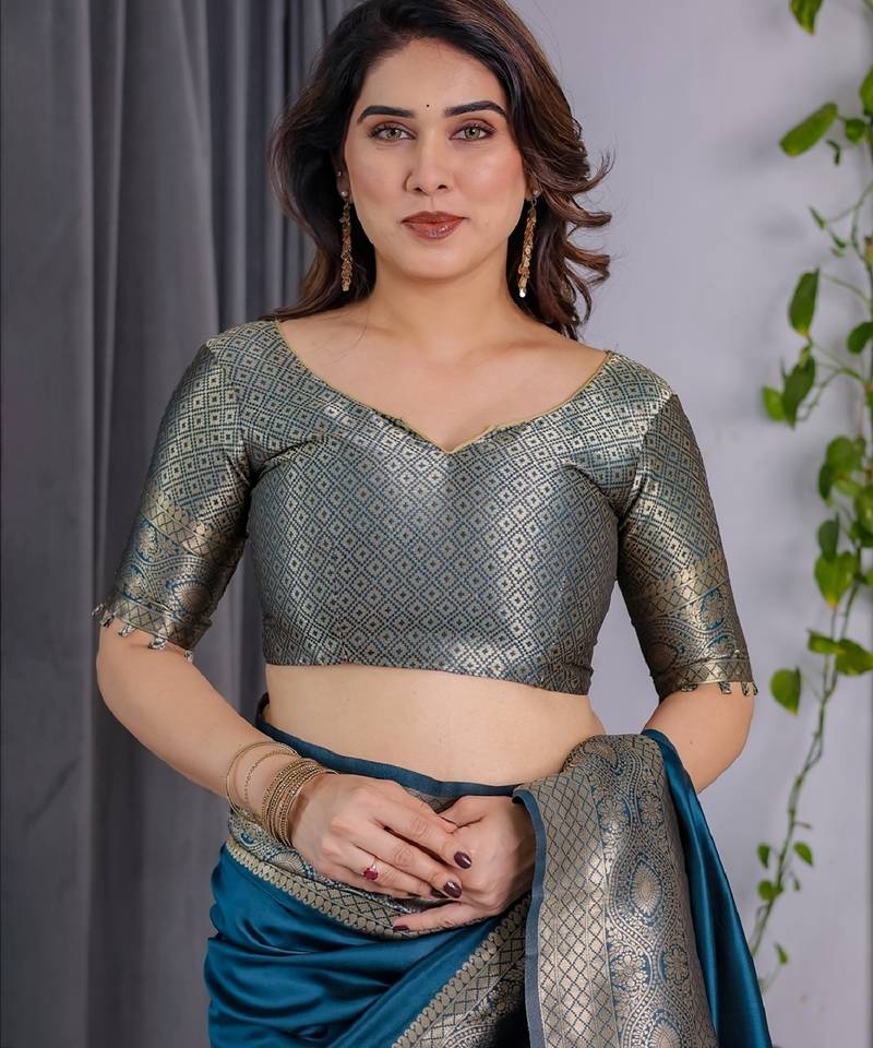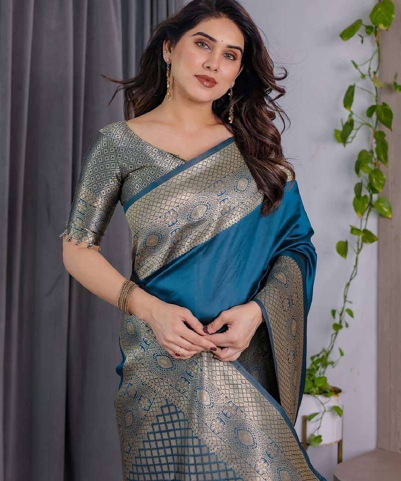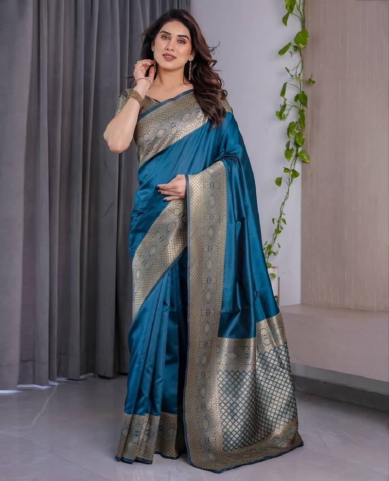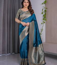 Turquoise soft art silk banarasi jacuard work designer party wear saree with unstitched blouse piece