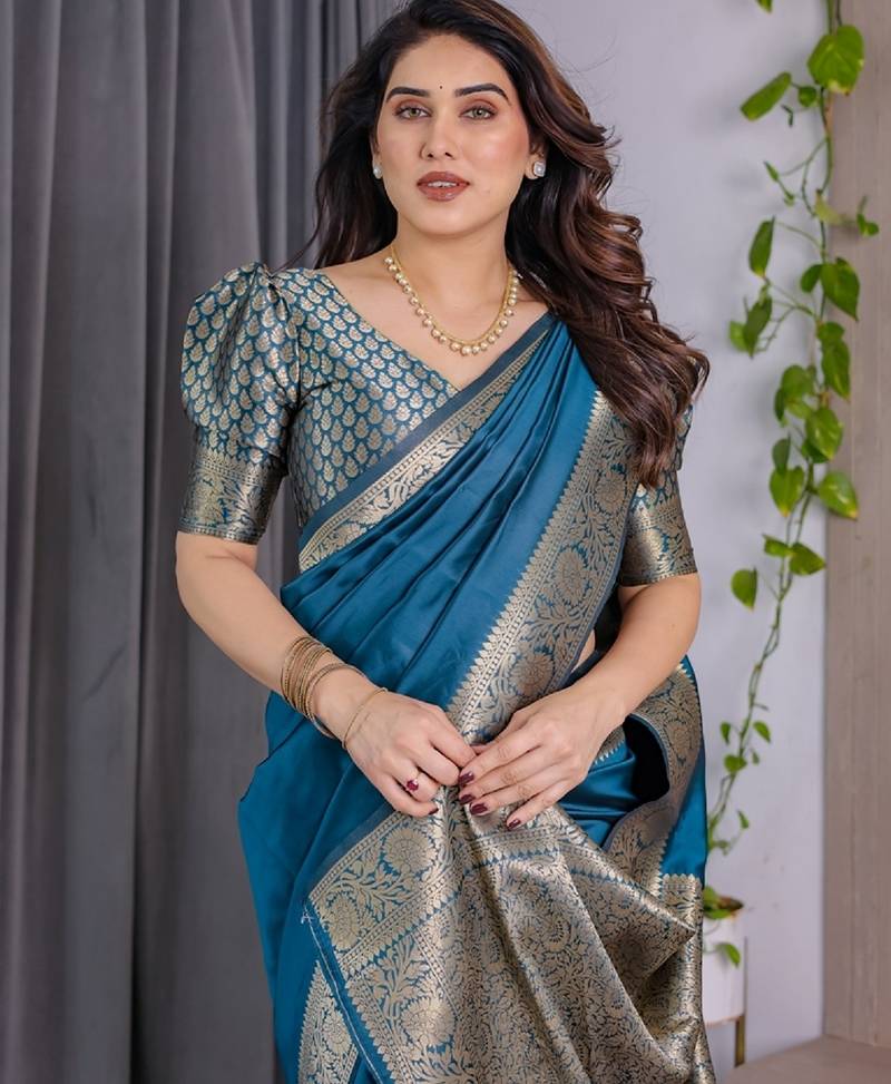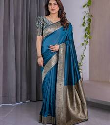 Turquoise soft art silk banarasi jacuard work designer party wear saree with unstitched blouse piece
