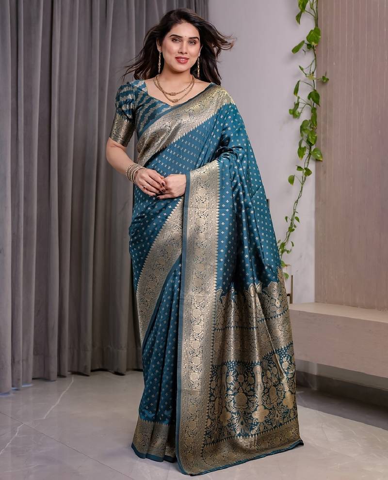 Turquoise soft art silk banarasi jacuard work designer party wear saree with unstitched blouse piece
