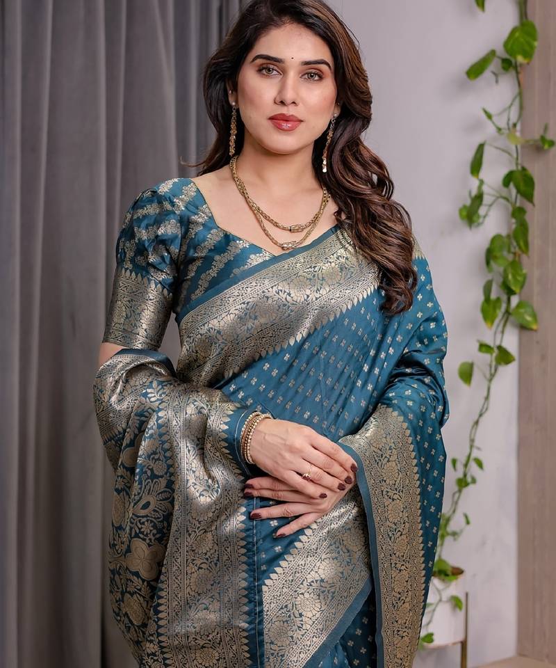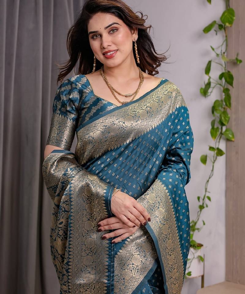 | Product Name | Turquoise Soft Art Silk Banarasi Jacuard Work Designer Party Wear Saree With Unstitched Blouse Piece | |
