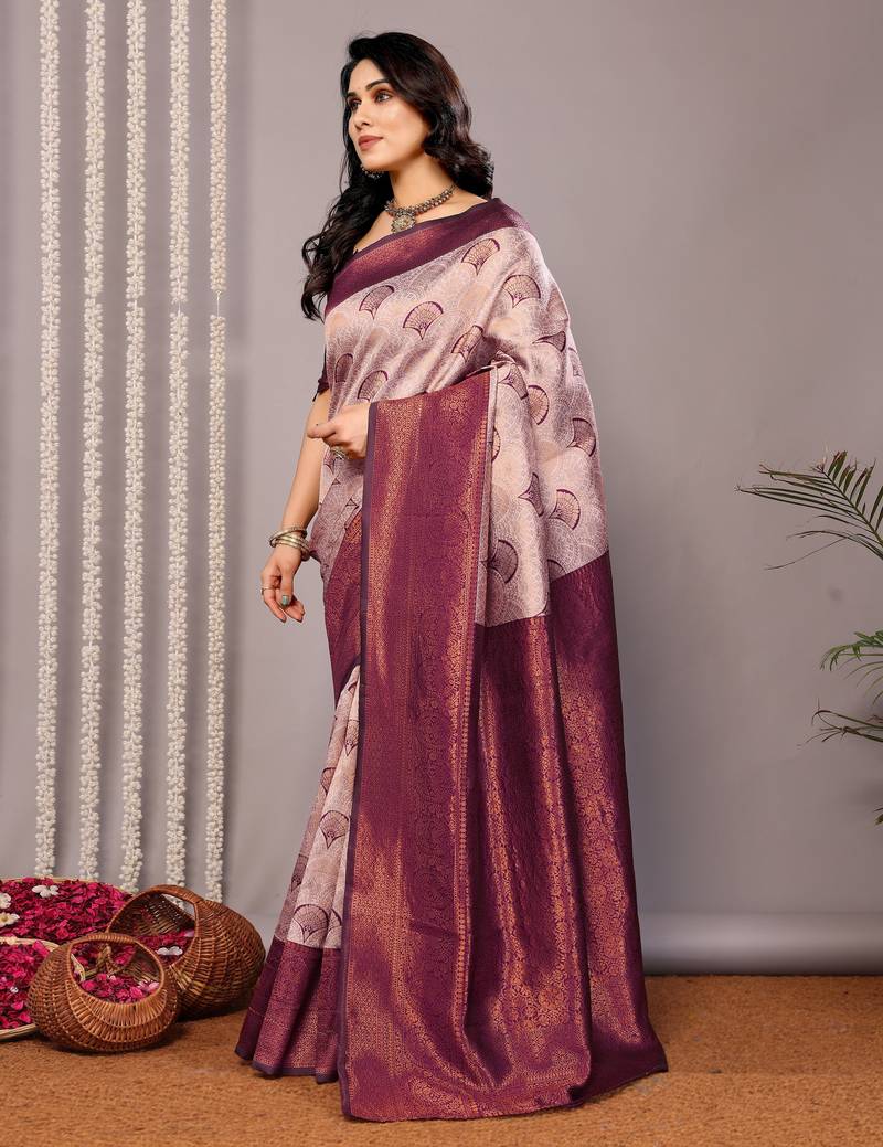 The Saree Features A Soft Peach Base Adorned With Delicate Woven Motifs That Enhance Its Royal Charm. The Rich Wine Colored Border And Pallu Are Intricately Designed With Traditional Banarasi Zari Weaving, Adding Depth, Contrast, And Grandeur To The Overall Look.