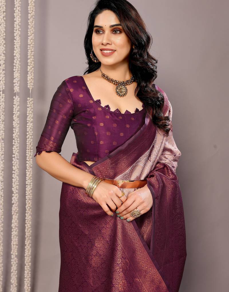 Wine soft silk blend banarasi jacuard work designer party wear saree with unstitched blouse piece