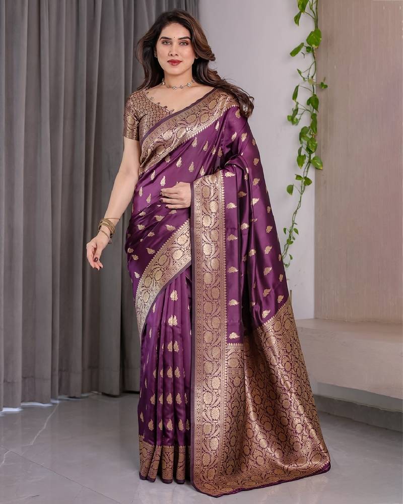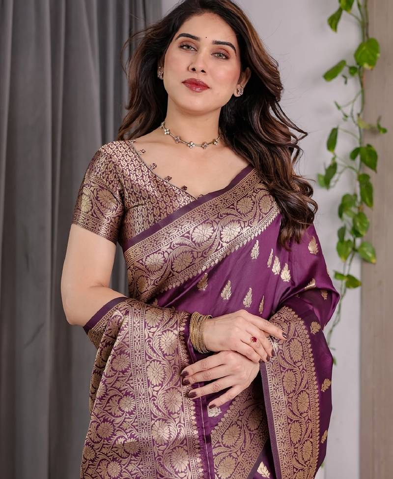 Wine soft art silk banarasi jacuard work designer party wear saree with unstitched blouse piece