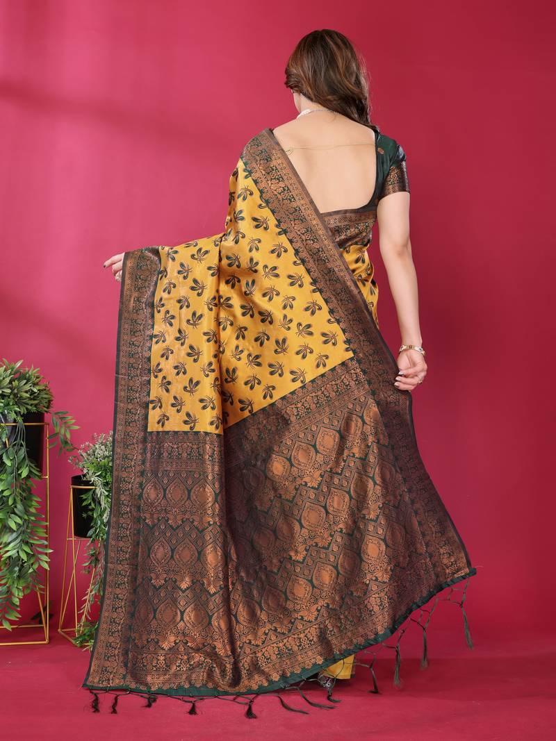 Yellow green soft art silk blend banarasi jacuard work designer party wear saree with unstitched blouse piece