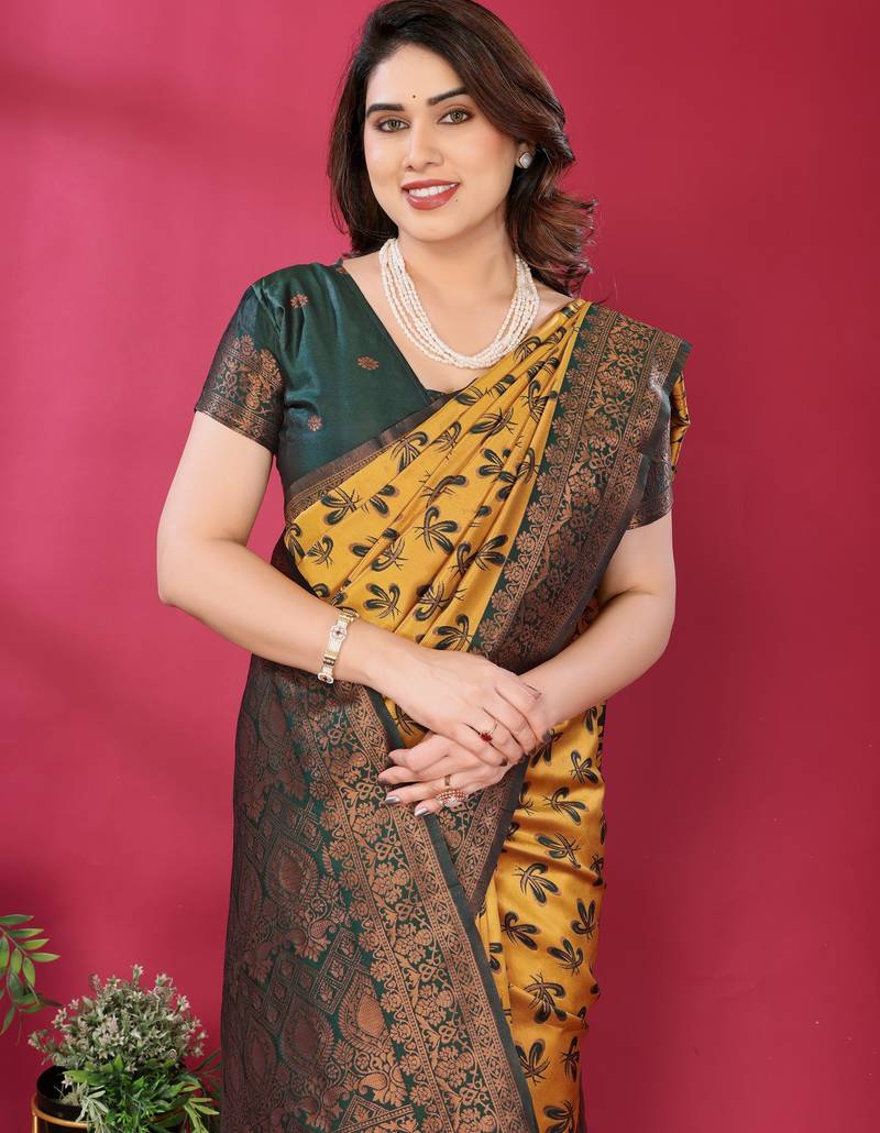 Product Name Yellow Green Soft Art Silk Blend Banarasi Jacuard Work Designer Party Wear Saree With Unstitched Blouse Piece