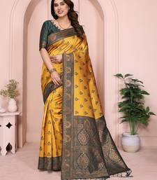 Yellow green soft art silk blend banarasi jacuard work designer party wear saree with unstitched blouse piece