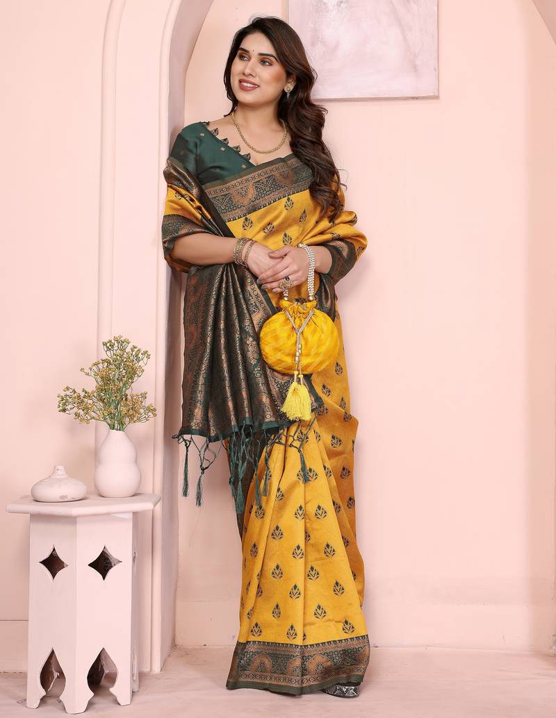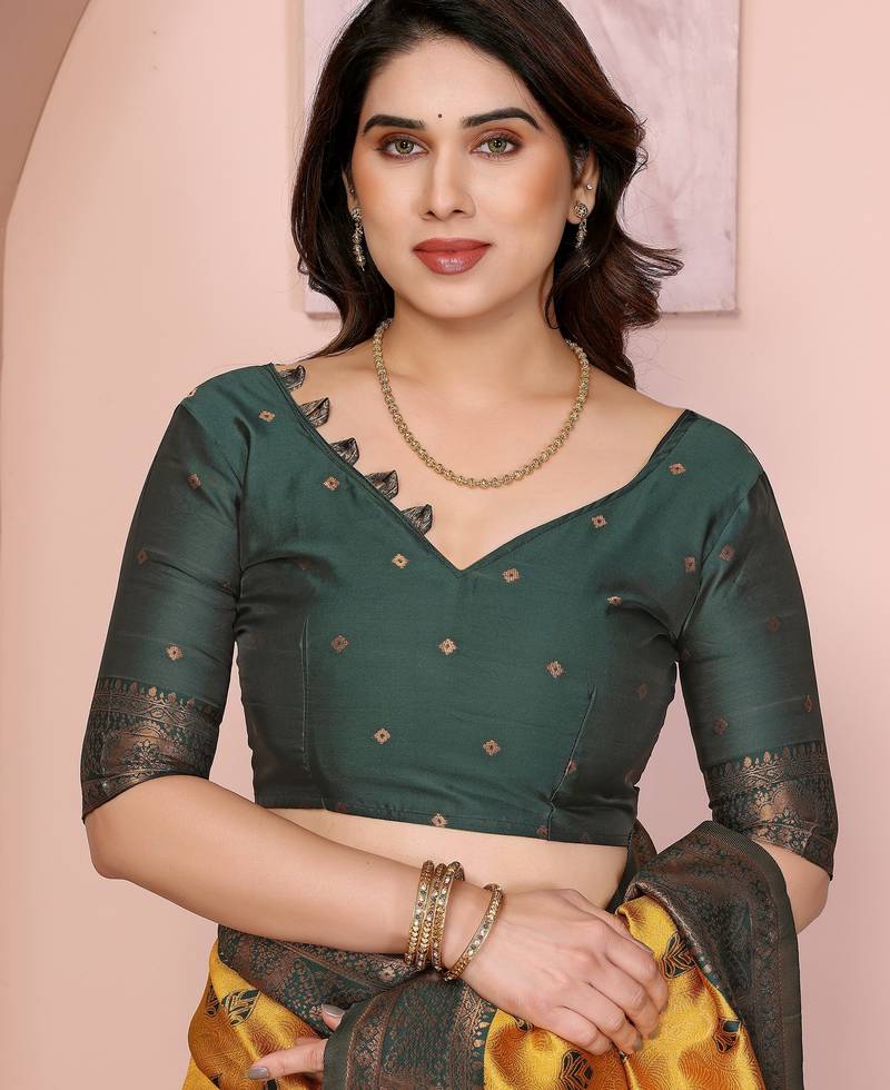 Product Name Yellow Green Soft Art Silk Blend Banarasi Jacuard Work Designer Party Wear Saree With Unstitched Blouse Piece