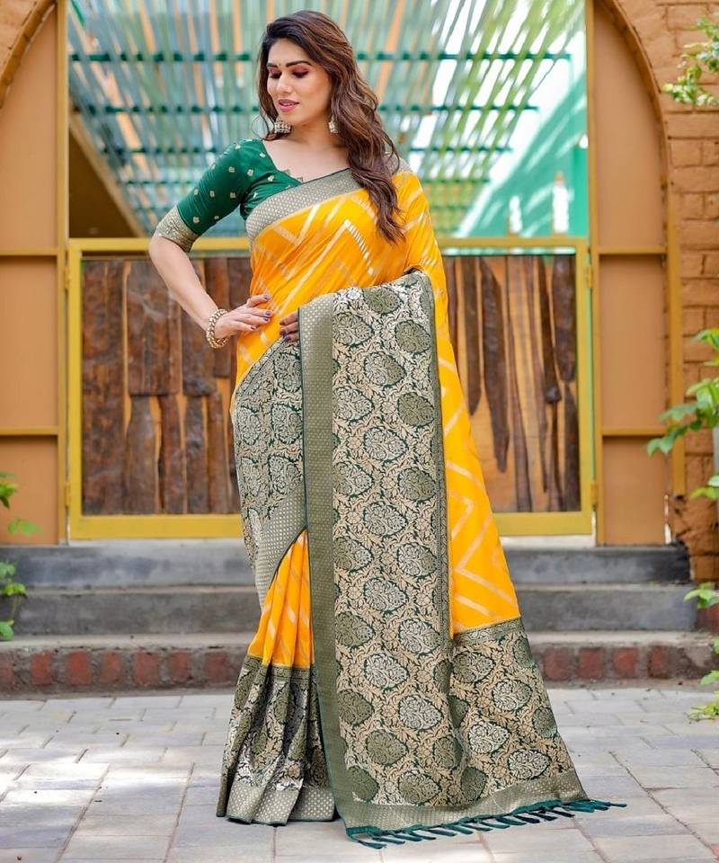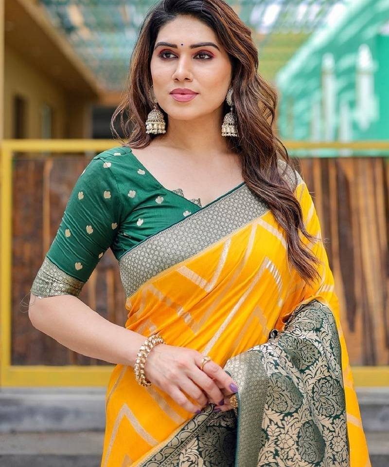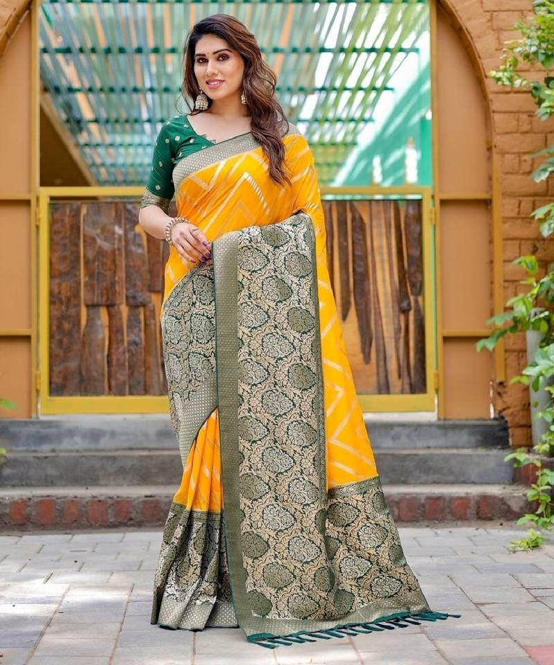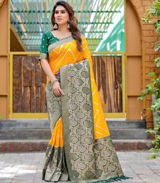 Yellow soft silk blend banarasi jacuard work designer party wear saree with unstitched blouse piece