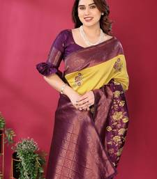 Yellpw wine soft art silk blend banarasi jacuard work designer party wear saree with unstitched blouse piece