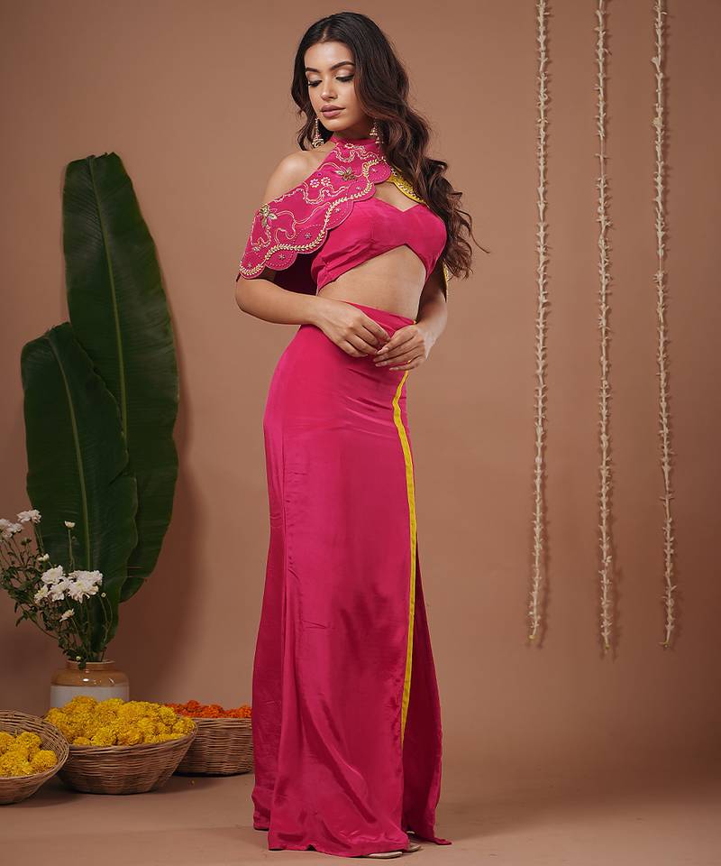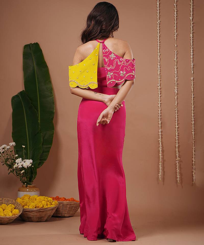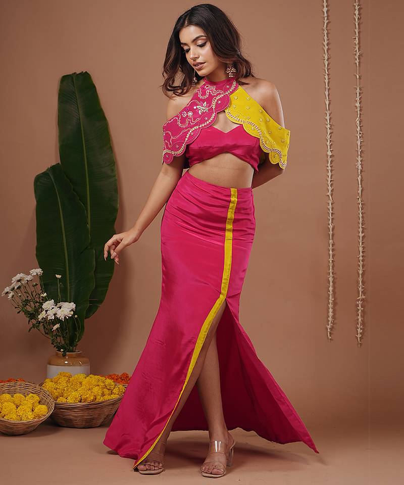 Product Description | Cold Shoulder Bustier Top With An Asymmetrical Layered.The Cape Has Scalloped Edges And Is Embellished With Bead, Sequin,Moti,Resham.A High Waisted Straight Fit Long Skirt With A Front Thigh High Slit Lined With A Contrasting Yellow Border.Bold Hot Pink Base With Contrasting Yellow Cape Panel And Slit Lining.Bustier Length : 13 " , Skirt Length: 42 " , Front Neck Depth: 10 " , Model Height: 5’7” , Model Is Wearing Xxs Size