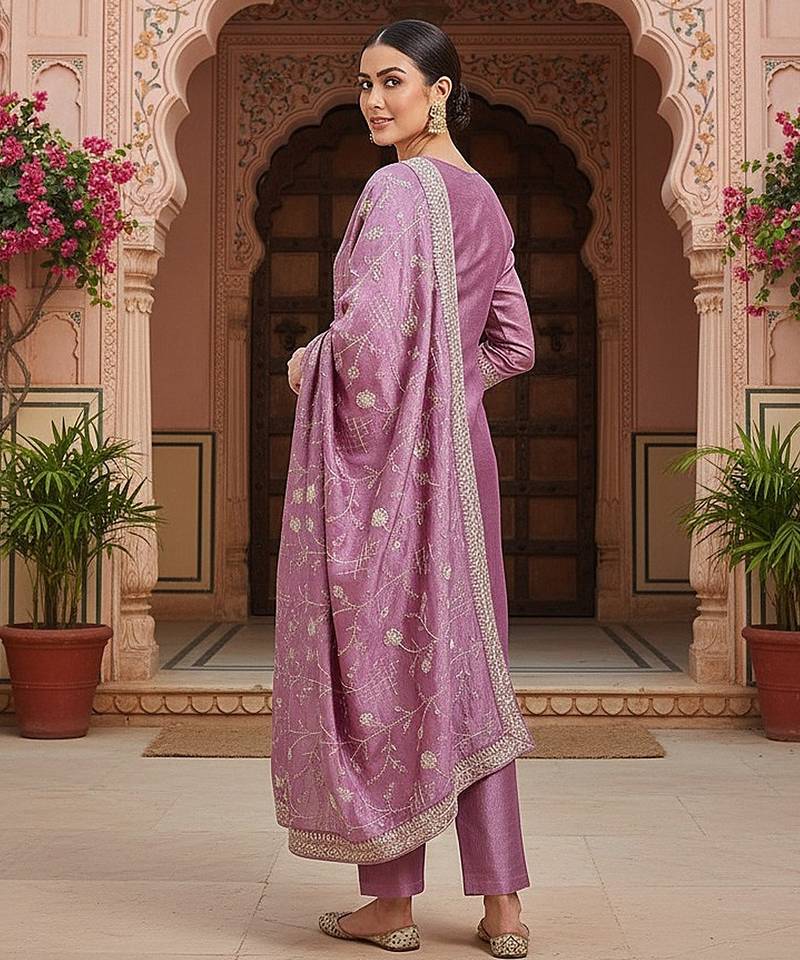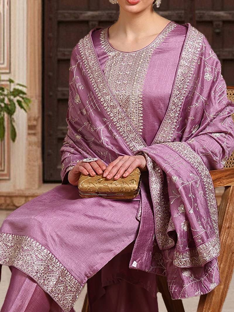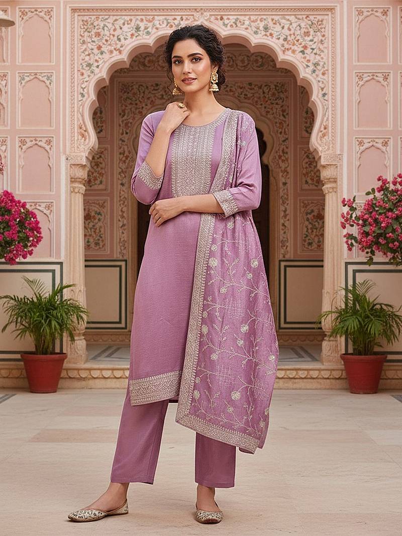 Lavender color embroidered silk blend styles kurta trouser with dupatta