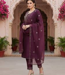 Purple color embroidered silk blend styles kurta trouser with dupatta