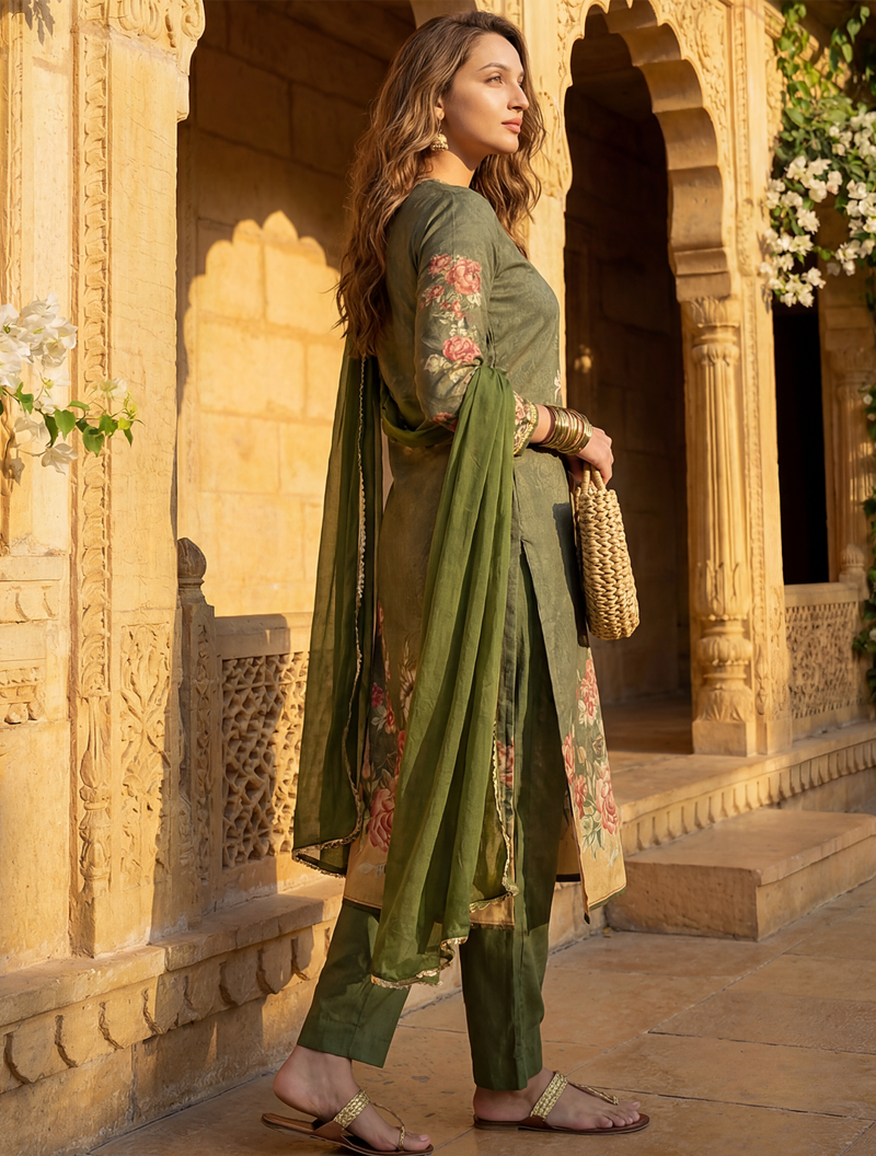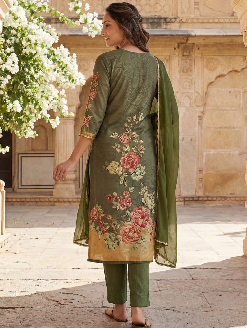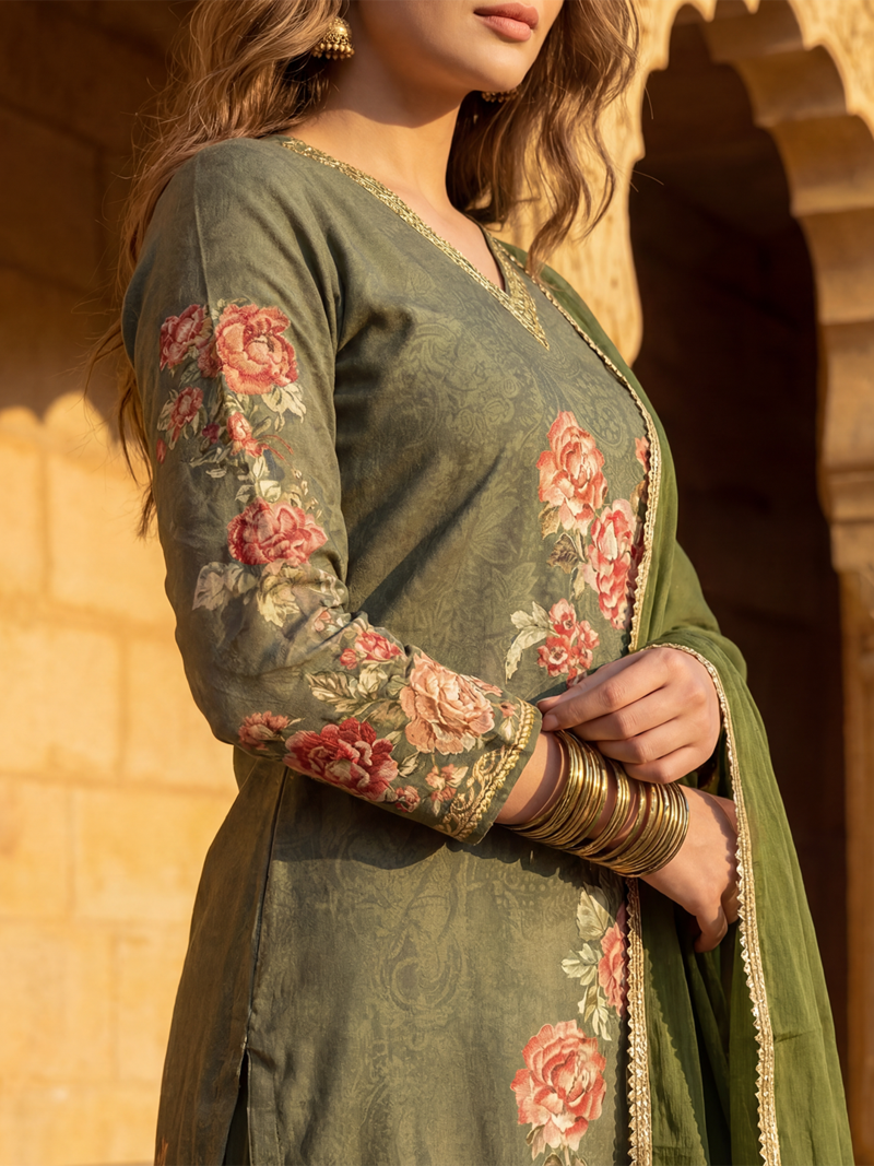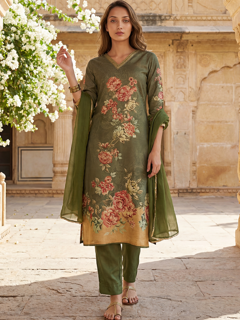 | Product Name | Women Olive Rayon Blend Floral Printed Straight Kurta Trouser With Dupatta | |