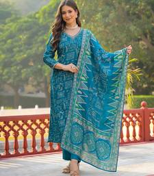 Women blue viscose ethnic motifs printed straight kurta trousers with dupatta