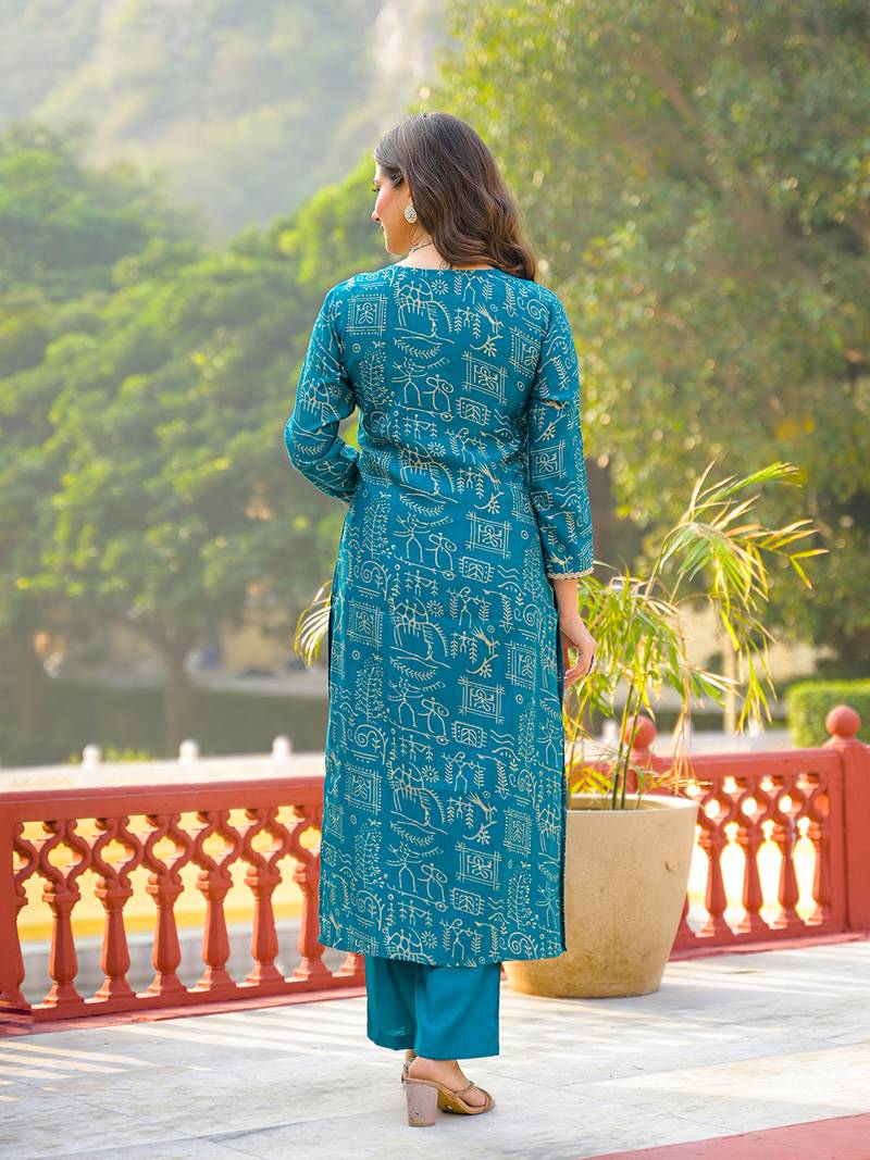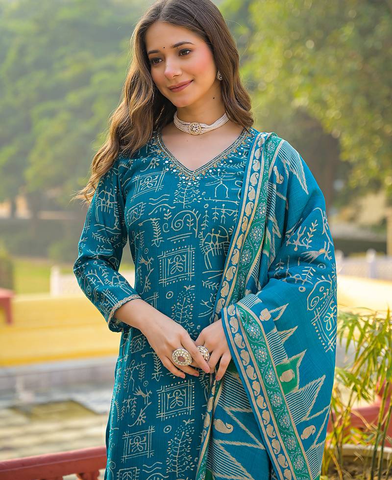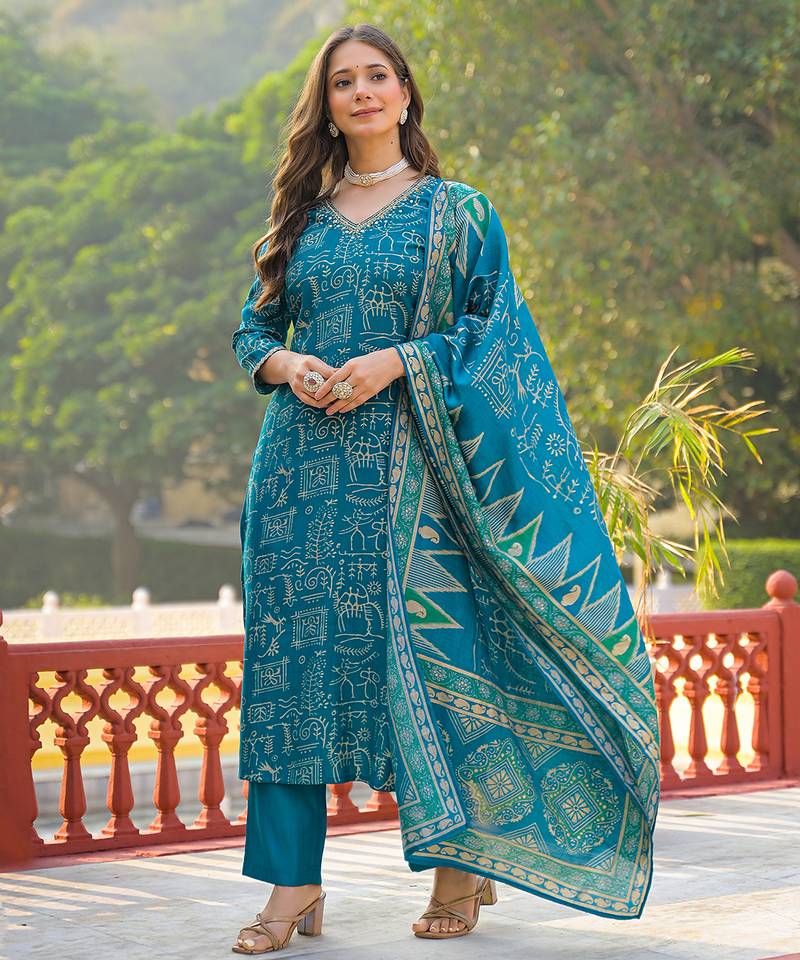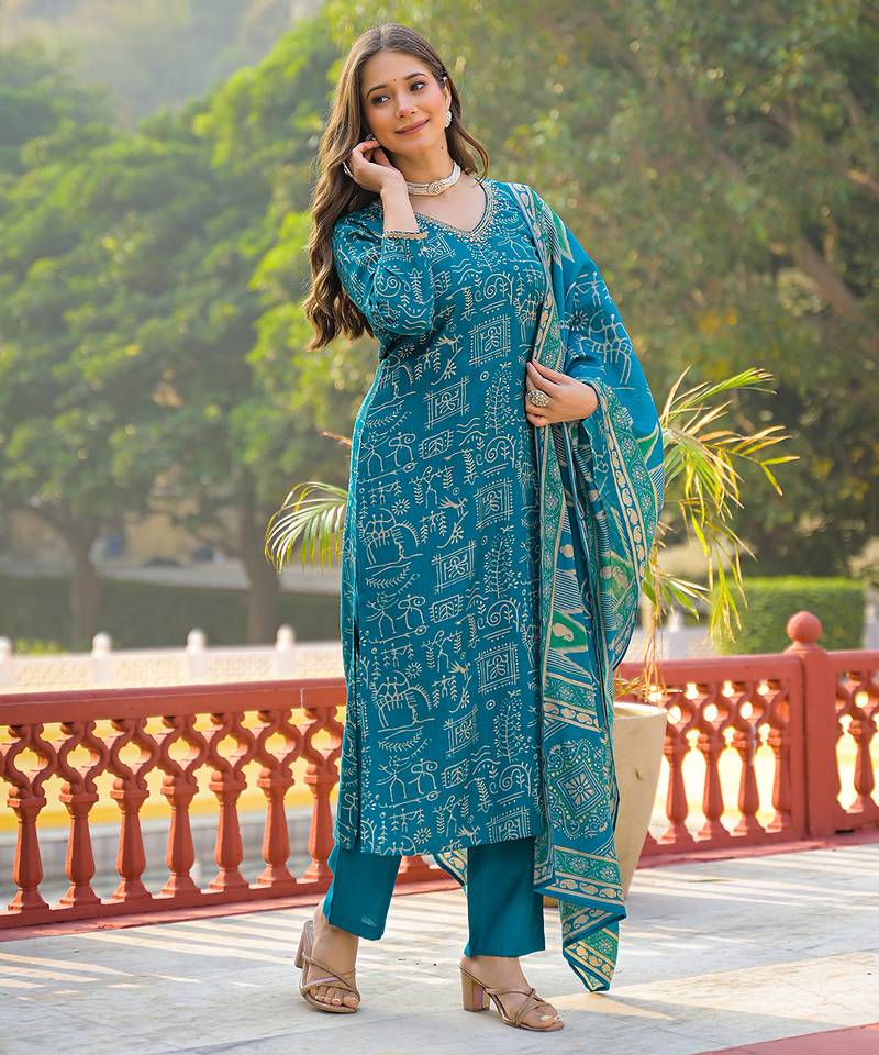 | Product Name | Women Blue Viscose Ethnic Motifs Printed Straight Kurta Trousers With Dupatta | |