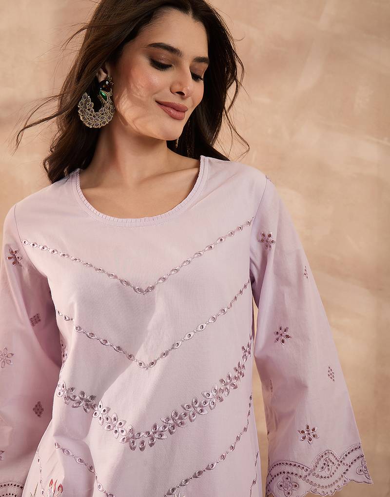 Women lavender pure cotton embroidered scalloped coord sets
