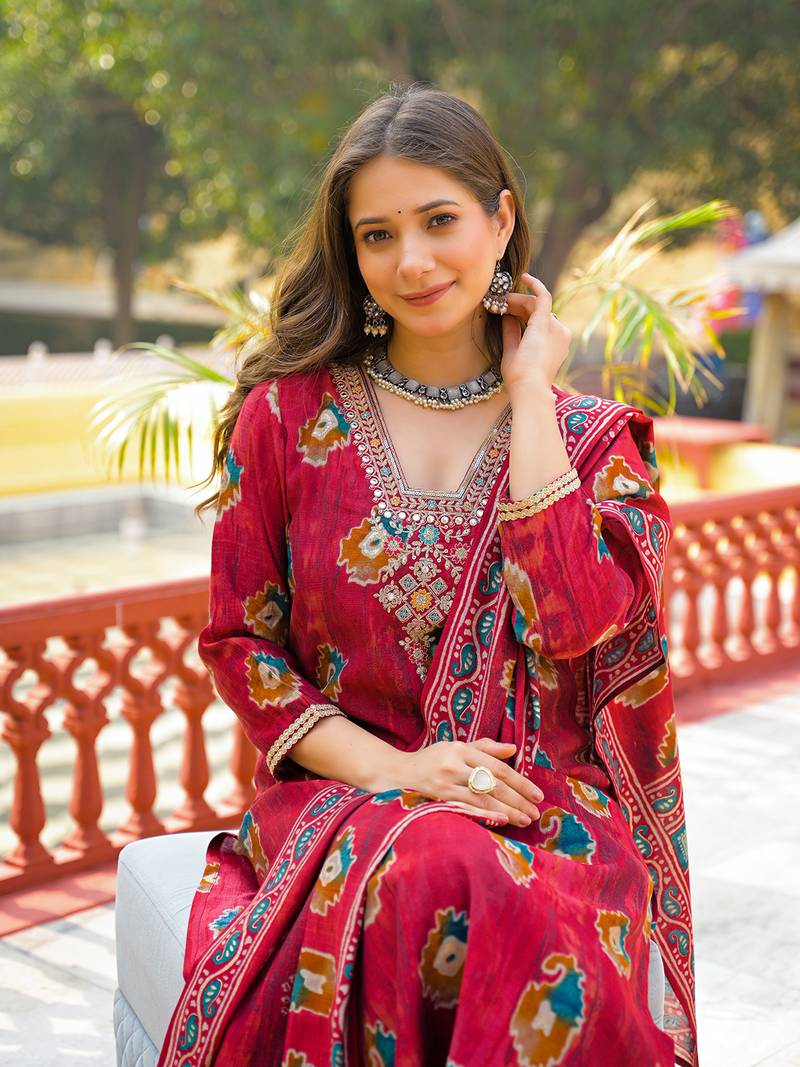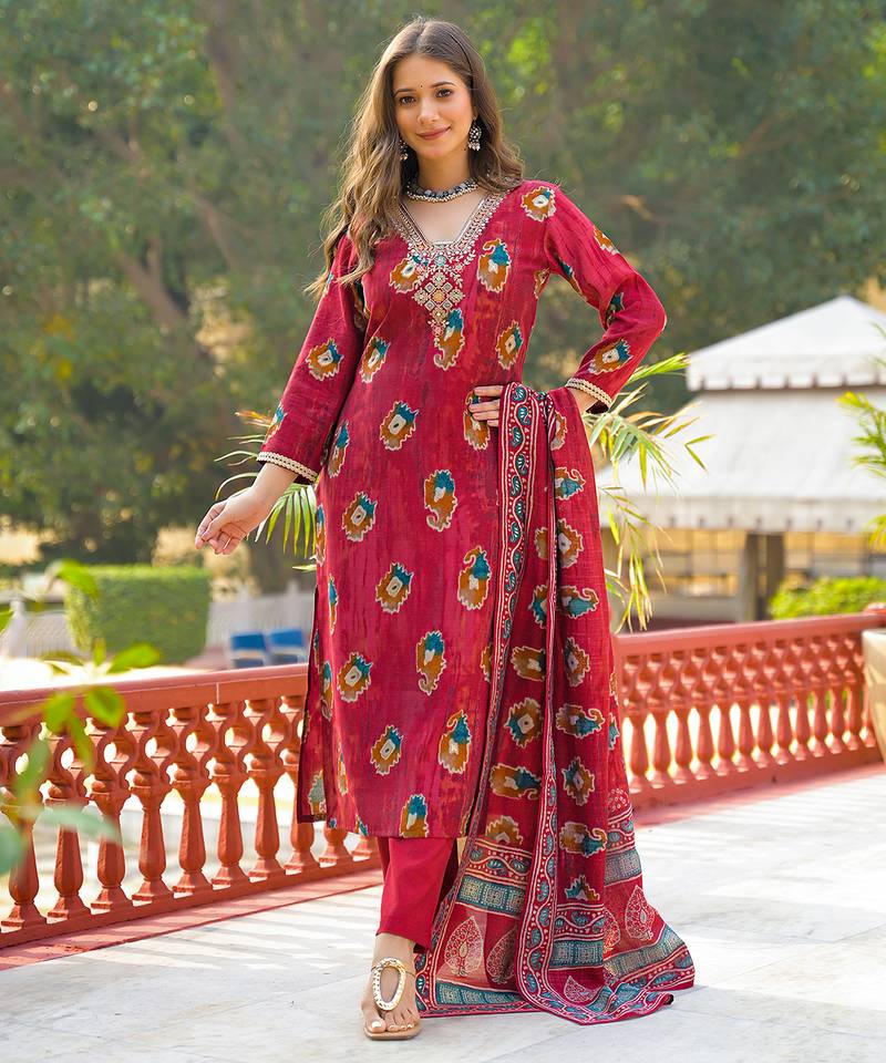 Women maroon viscose embroidered straight kurta trousers with dupatta