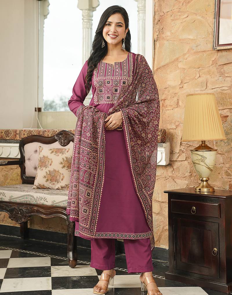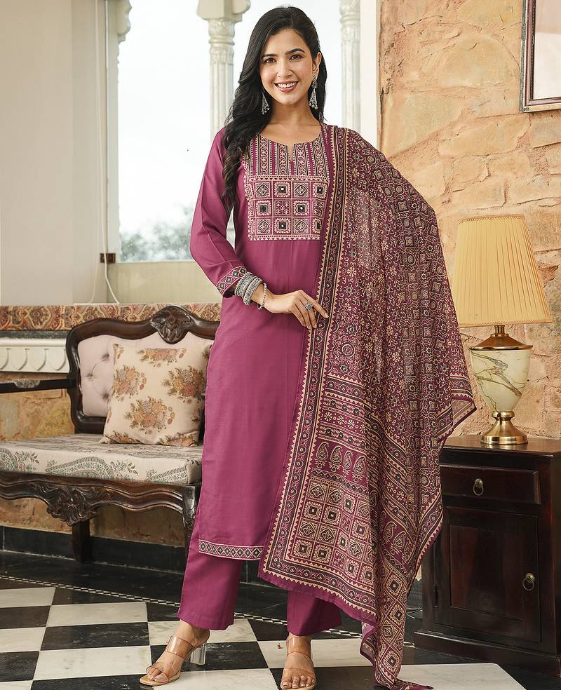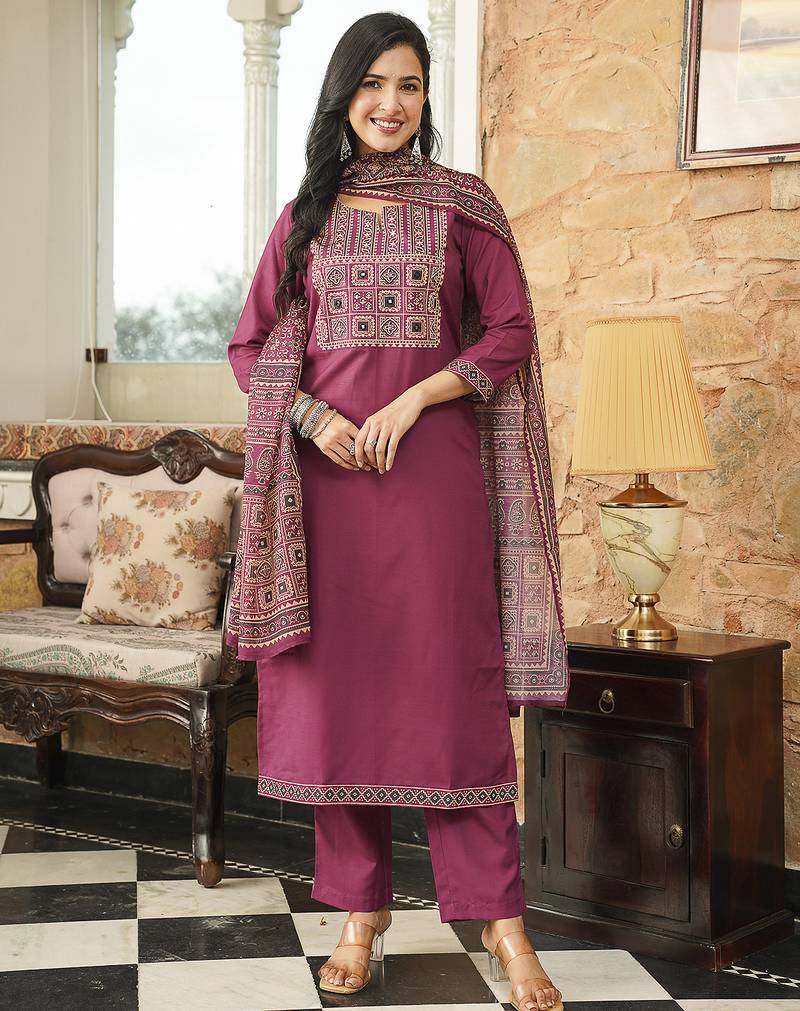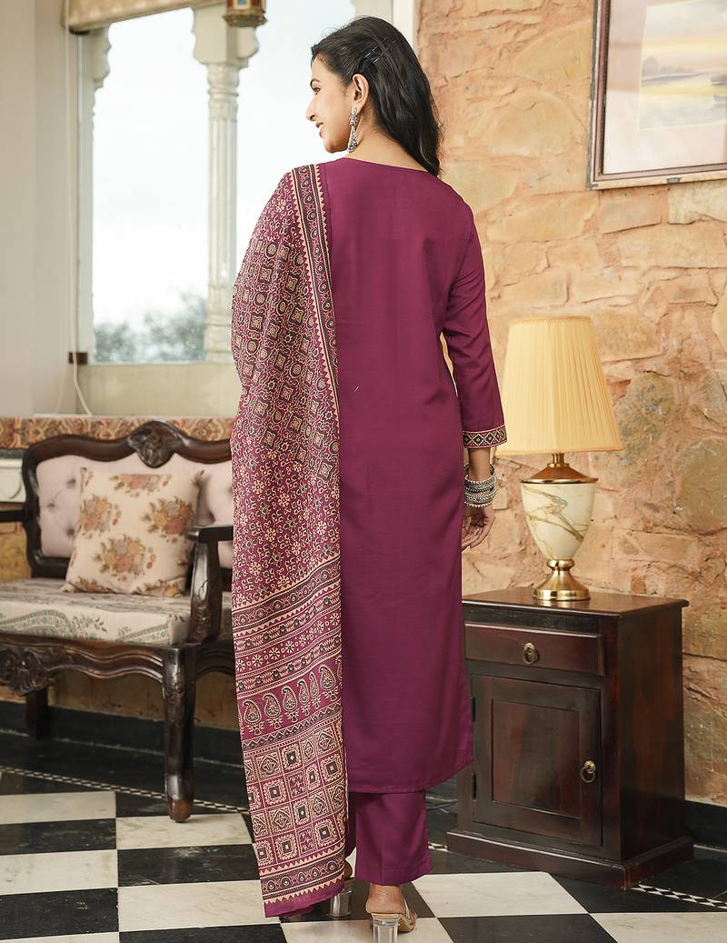 | Product Name | Women Purple Rayon Blend Ajrakh Printed Straight Kurta Trousers With Dupatta | |