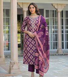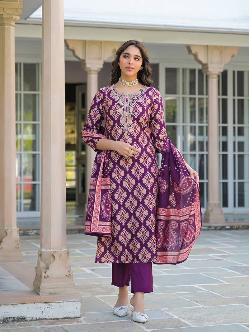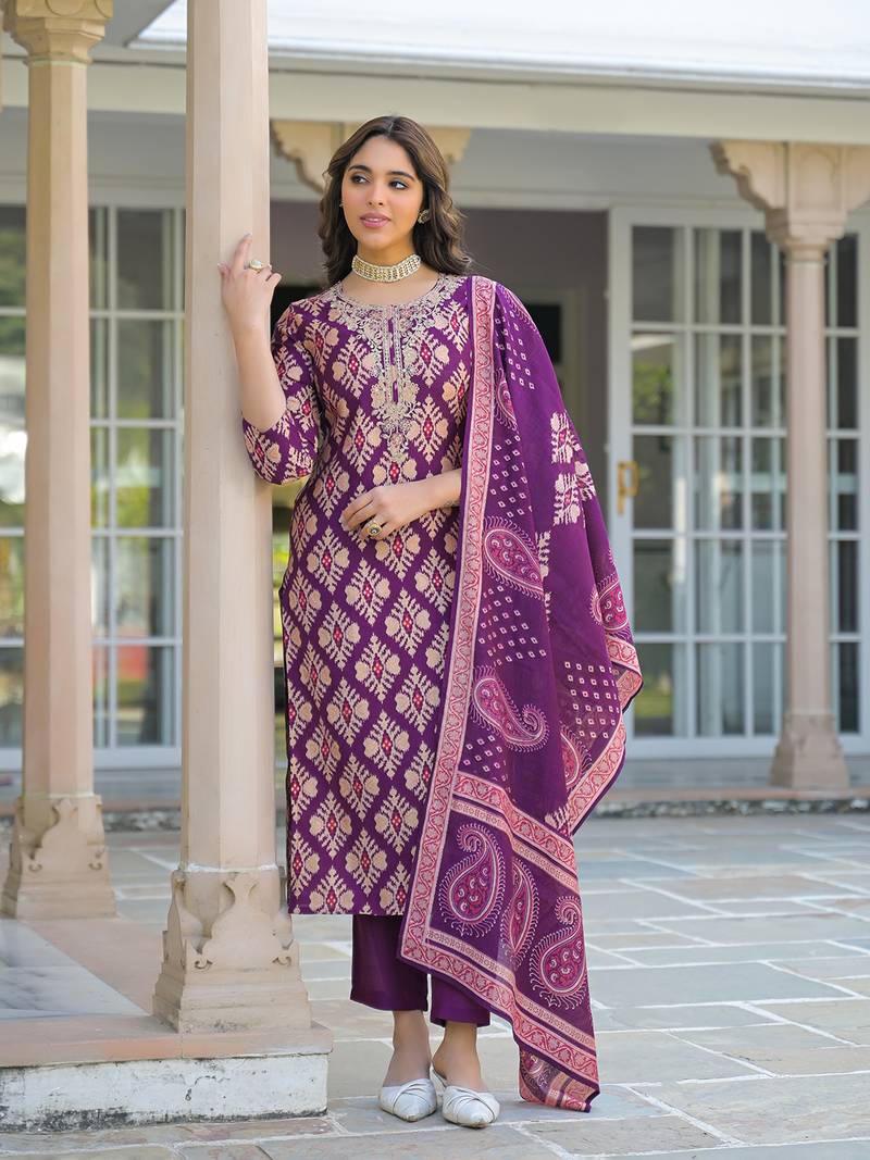 | Product Name | Women Purple Viscose Ikat Embroidered Straight Kurta Trousers With Dupatta | |
