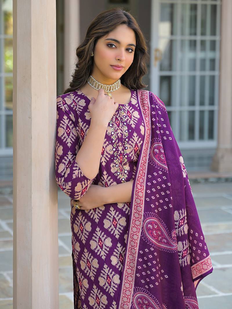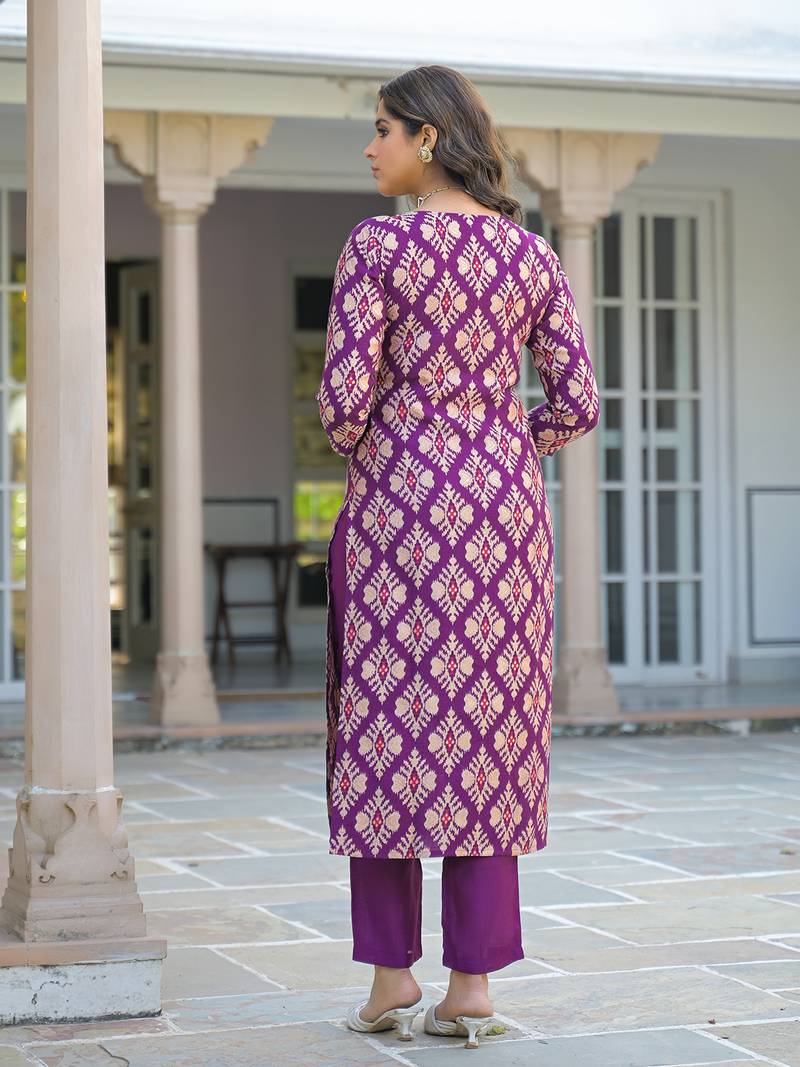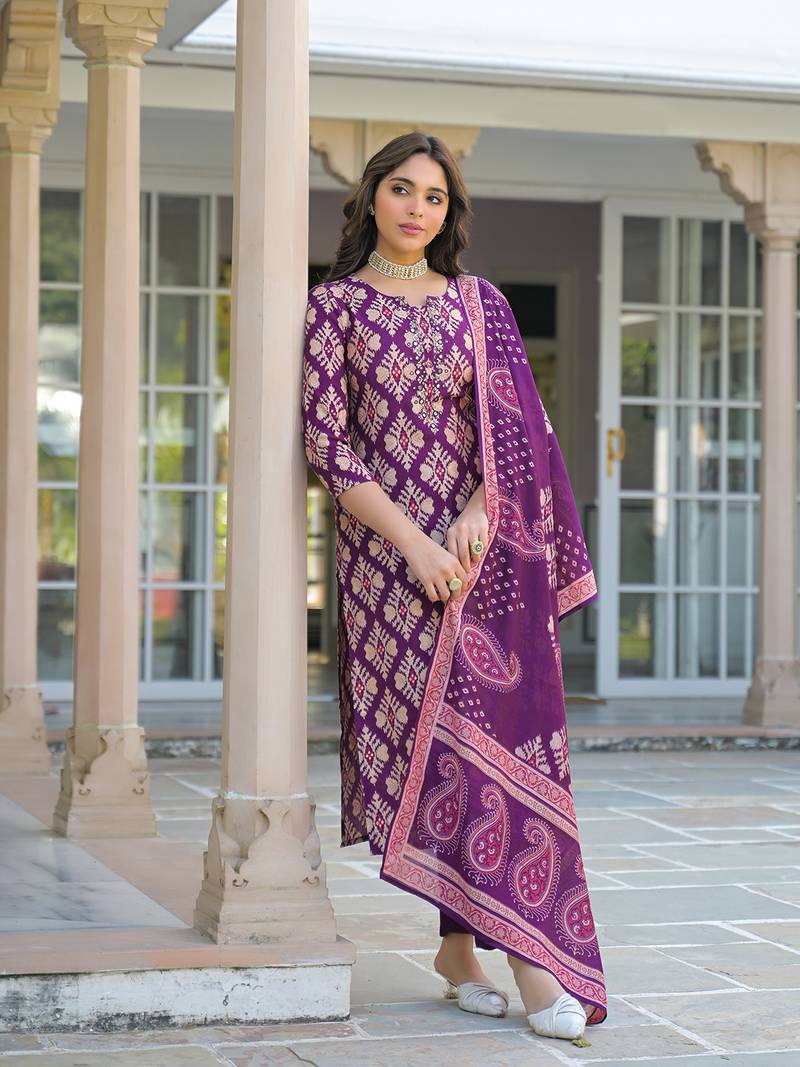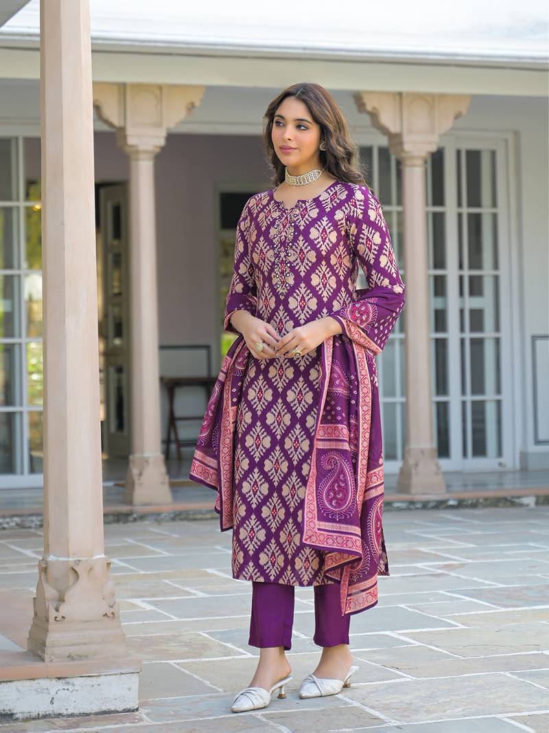 | Product Name | Women Purple Viscose Ikat Embroidered Straight Kurta Trousers With Dupatta | |