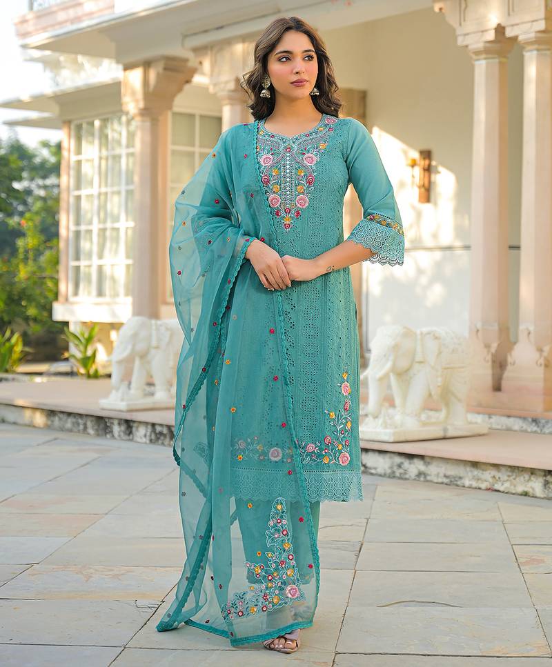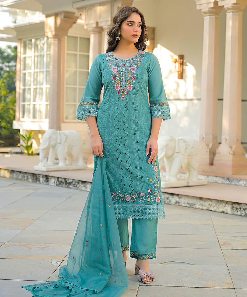 Women sea green viscose embroidered straight kurta trousers with dupatta