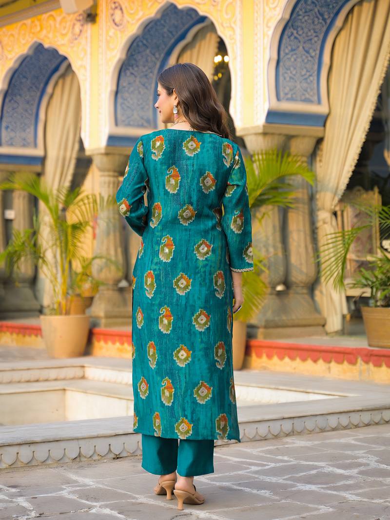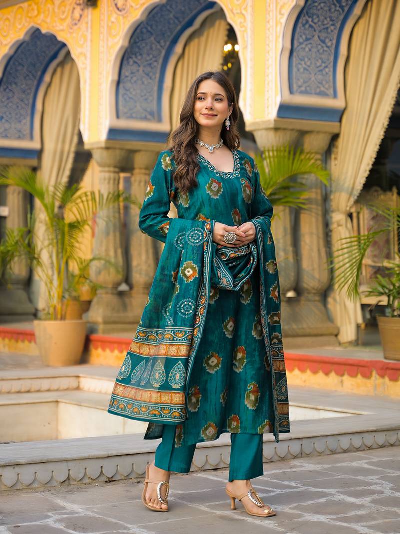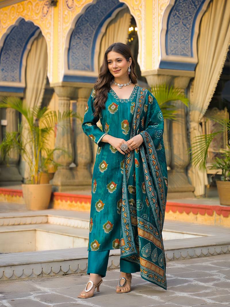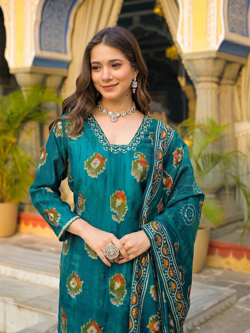 | Product Name | Women Teal Viscose Embroidered Straight Kurta Trousers With Dupatta | |