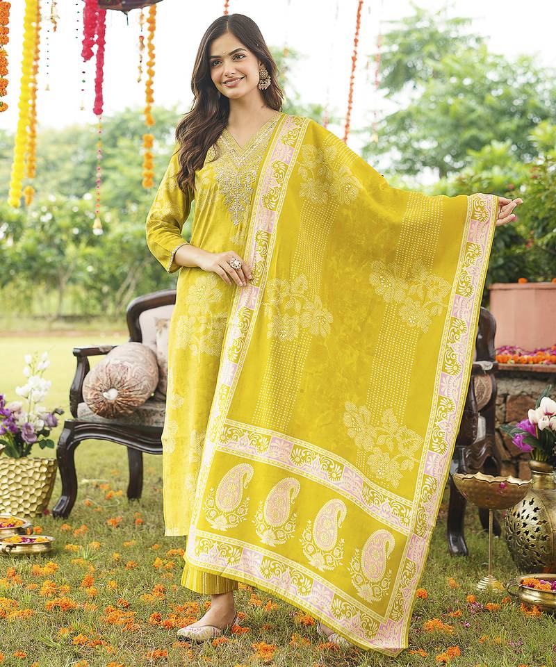 Product Name | Women Yellow Poly Chanderi Floral Embroidered Straight Kurta Trousers With Dupatta | |