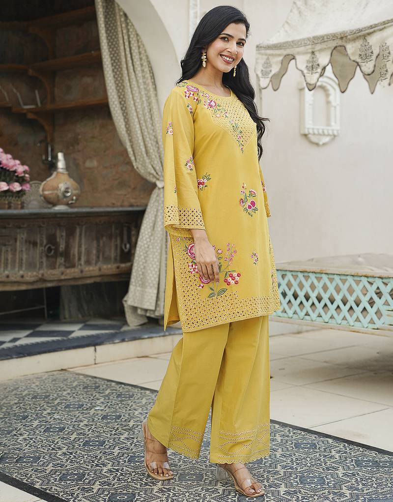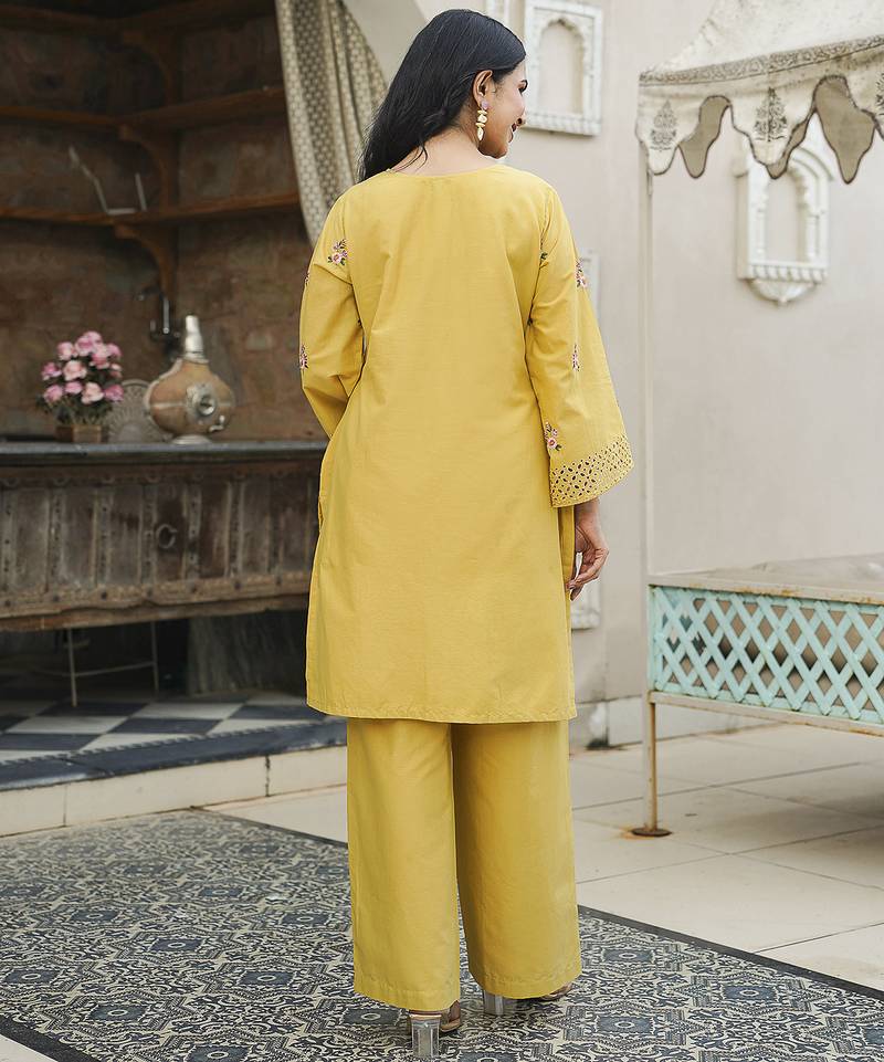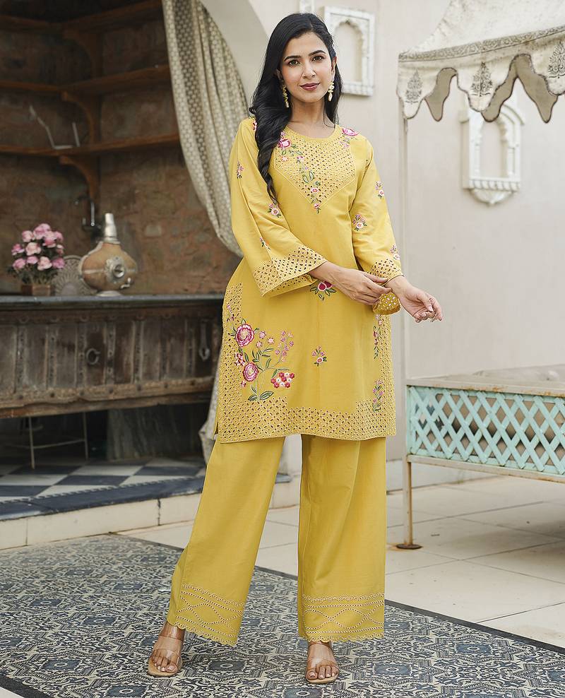 Product Name | Women Yellow Pure Cotton Solid Embroidered Coord Sets | |