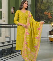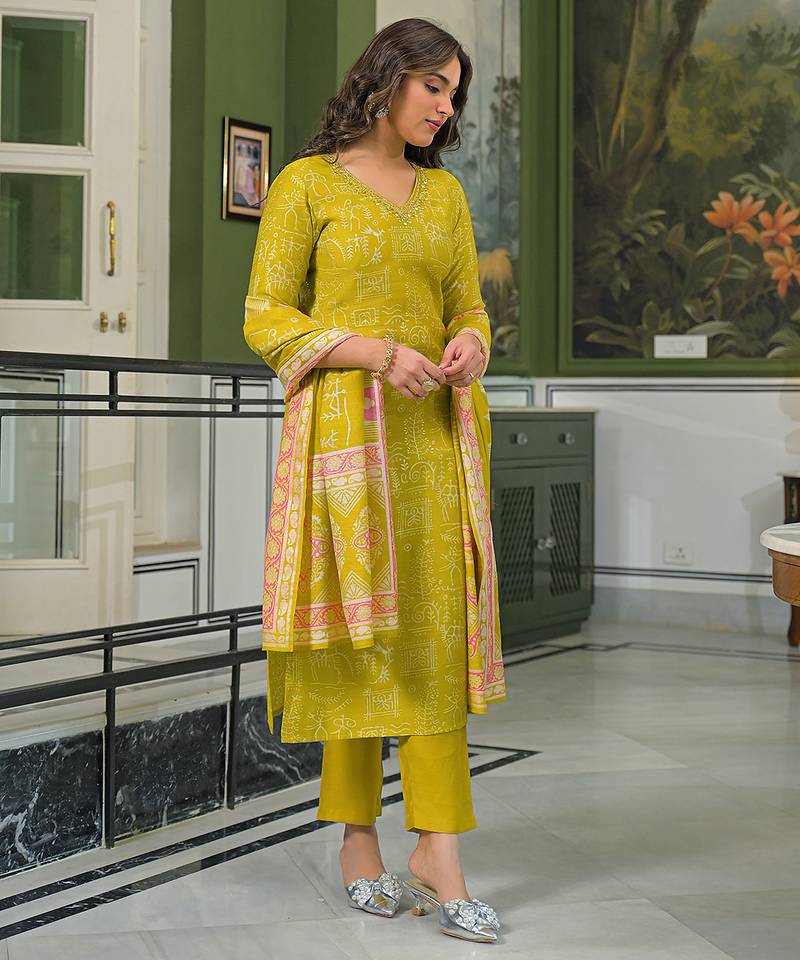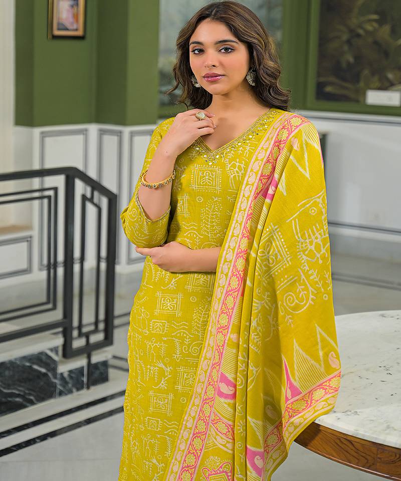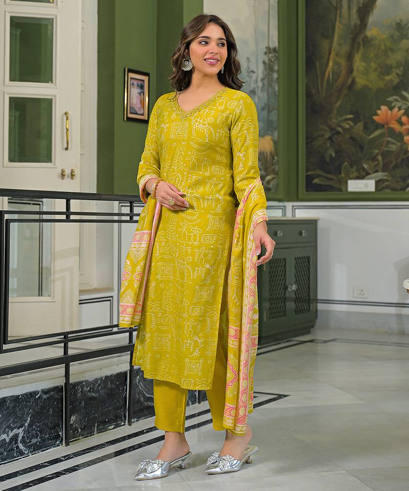 | Product Name | Women Yellow Viscose Ethnic Motifs Printed Straight Kurta Trousers With Dupatta | |