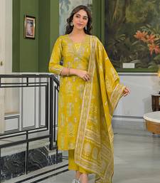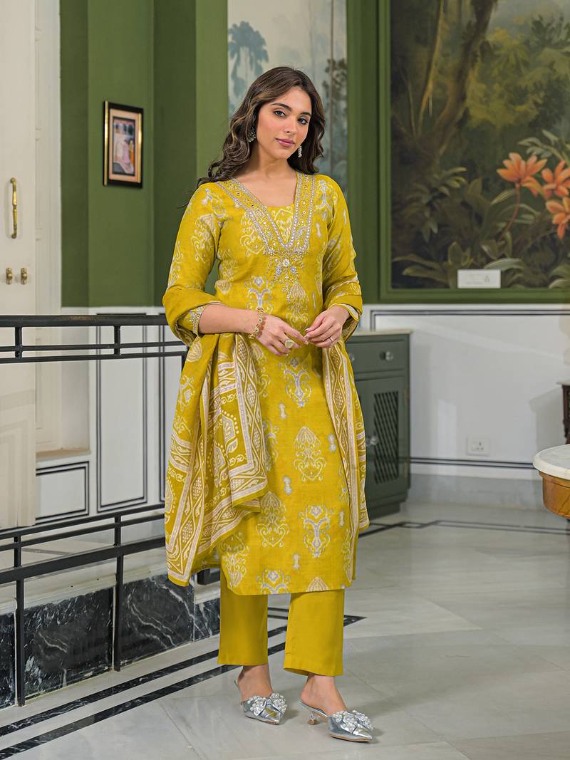 Product Name Women Yellow Viscose Ikat Printed Straight Kurta Trousers With Dupatta