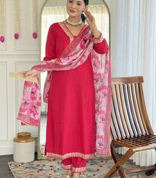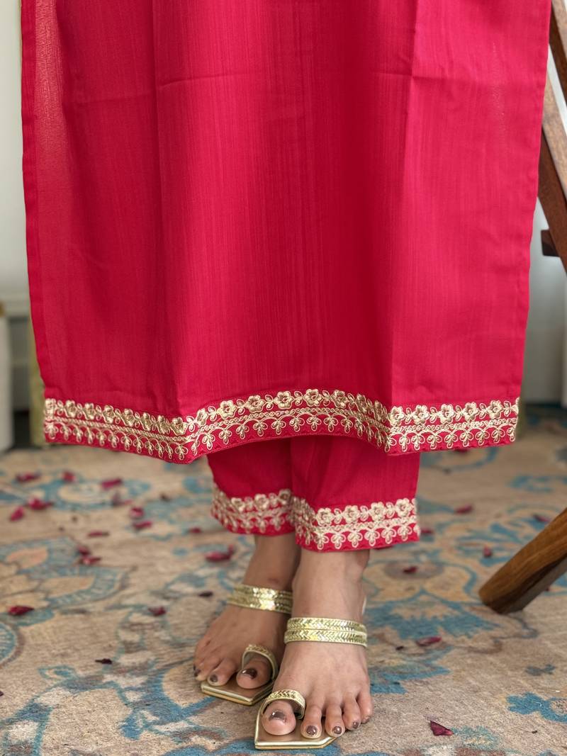 Rani pink kurta set with floral printed dupatta & gota detailing stitched