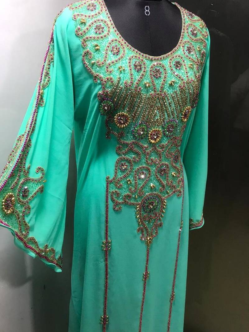 Sea green arabic fancy sleeves kaftan with heavy beading work
