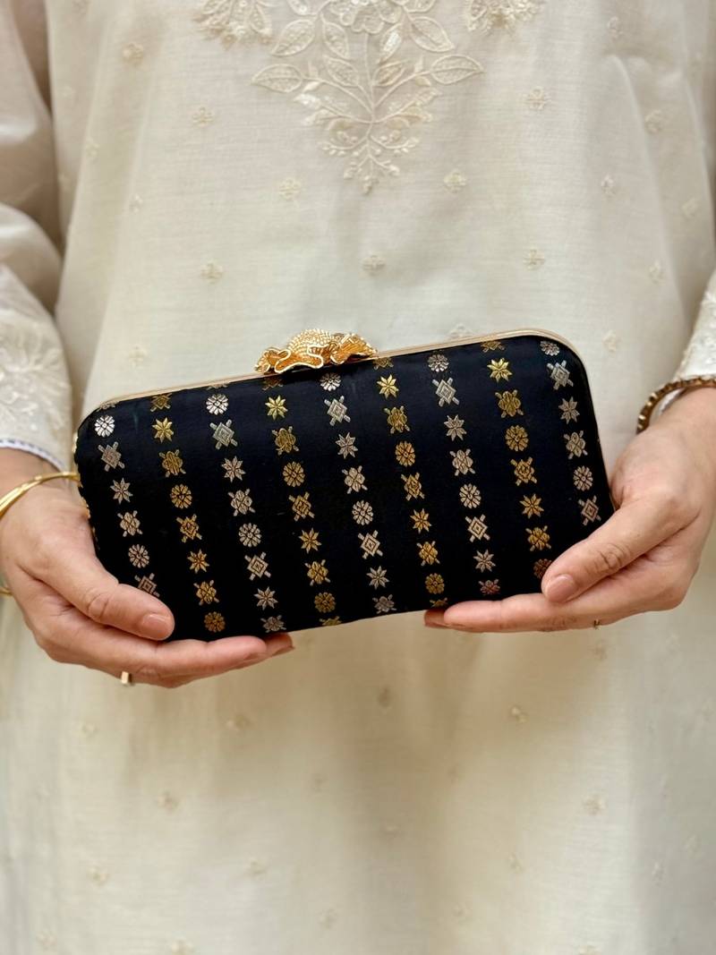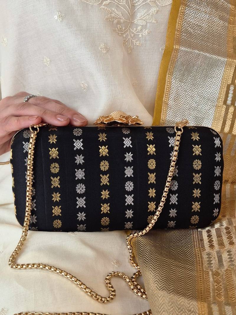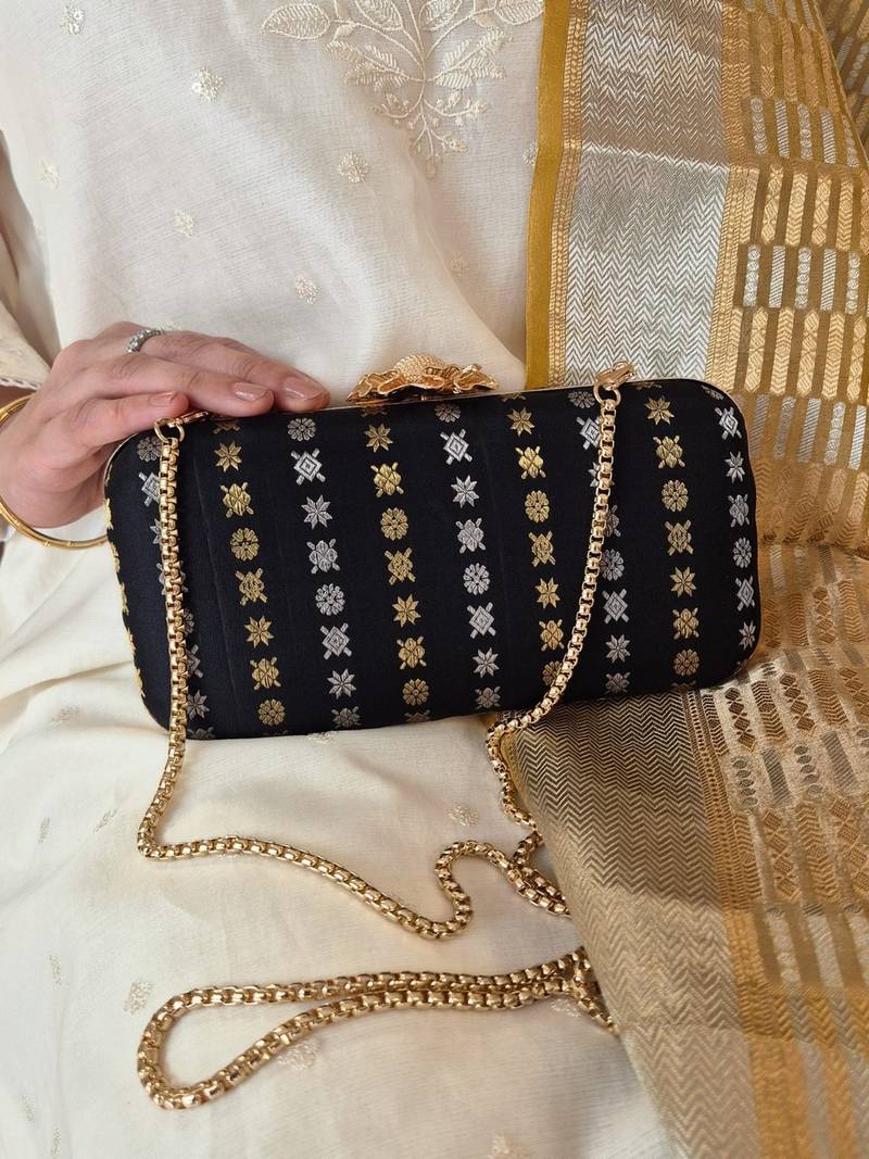 Product Description | Crafted From Pure Kanchi Silk, This Elegant Black Clutch Is Adorned With Intricate Gold And Silver Zari Buta, Making It A Timeless Addition To Your Collection. The Dual Zari Work Allows Versatile Styling, Effortlessly Complementing Both Gold And Silver Accents In Your Outfits. A Delicate Flower Lock Adds A Touch Of Charm And Sophistication, Enhancing Its Overall Appeal.