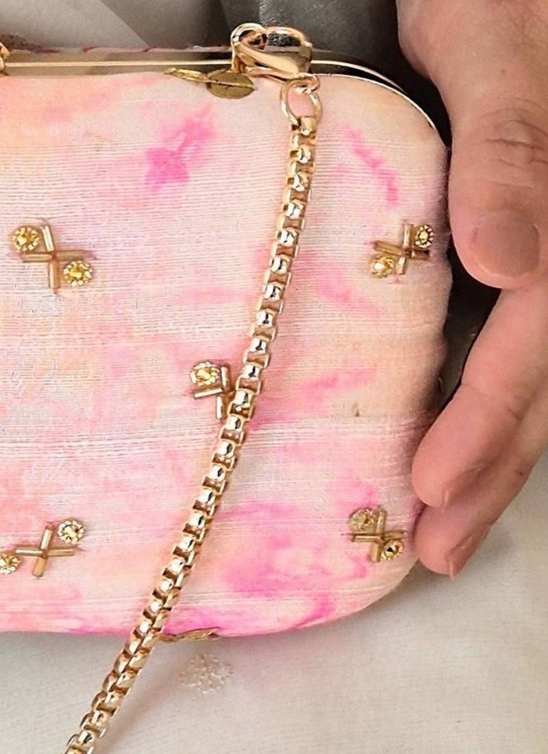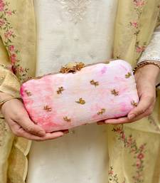 Product Description | A Subtle Pink Shibori Work Clutch In A Graceful Ombré Blend Of Pink To Cream Tones. Embellished With Delicate Gold Embroidery And Finished With A Charming Flower Lock, This Clutch Exudes Elegance With A Modern Twist. A Versatile Accessory, Perfect For Festive Occasions, Weddings, Or Evening Gatherings.