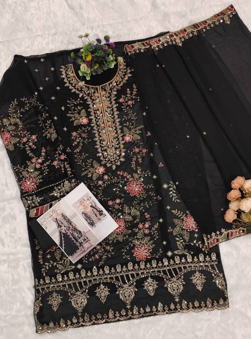 Black silk suit with embroidery & sequin work semi stitched