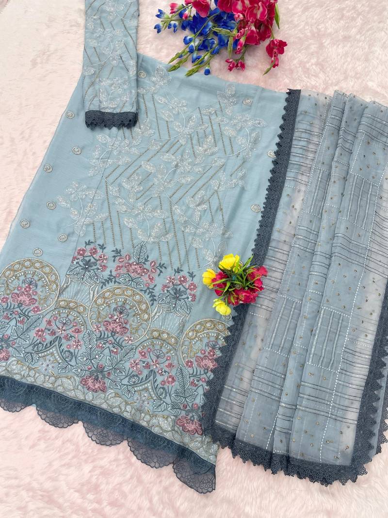 Product Name Blue Chiffon Semi Stitched Suit With Embroidery & Sequence Work