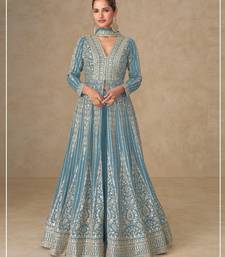 Blue chinon free size stitched anarkali suits with embroidery & sequence work