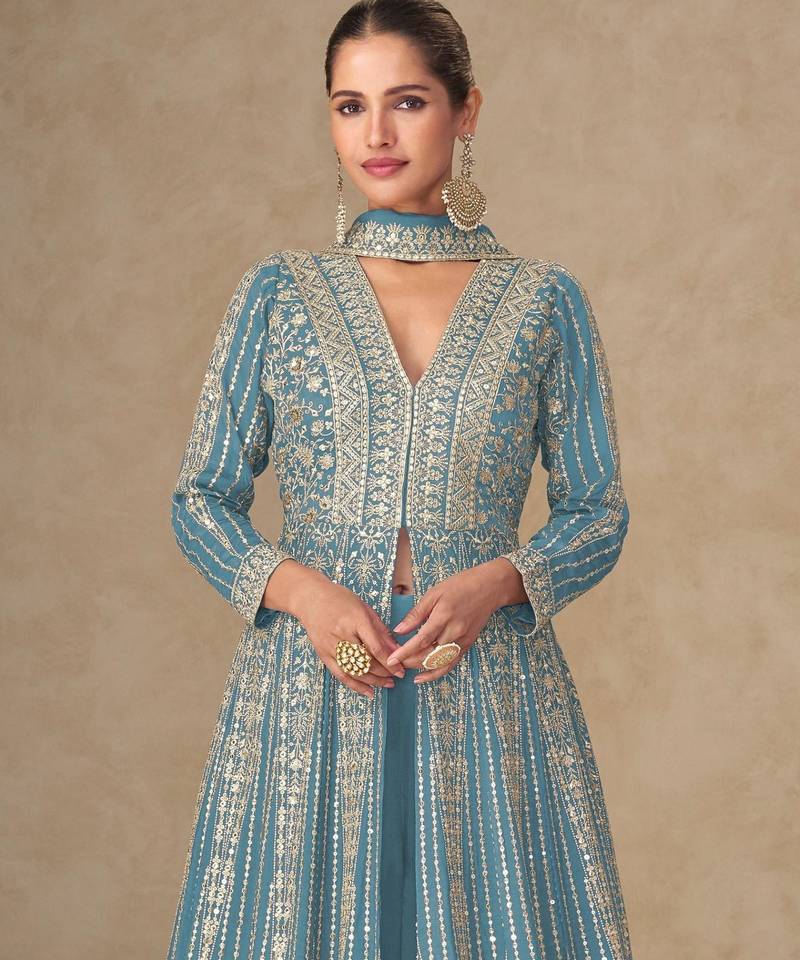 | Product Name | Blue Chinon Free Size Stitched Anarkali Suits With Embroidery & Sequence Work | |