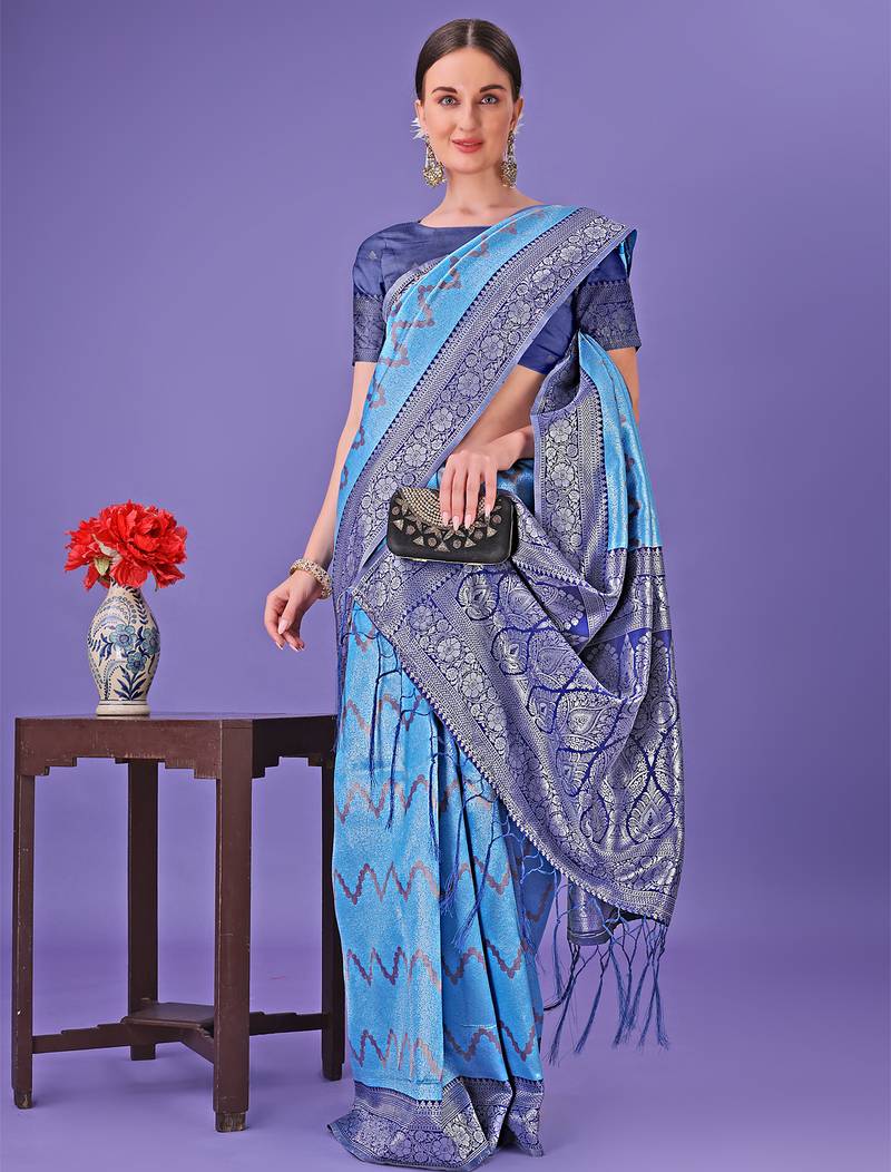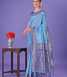 Blue lichi art silk with printed and zari weaving saree with blouse
