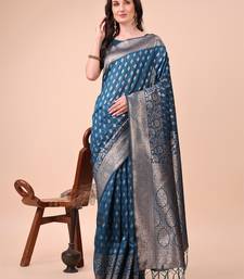 Blue lichi art silk with woven zari work saree with blouse
