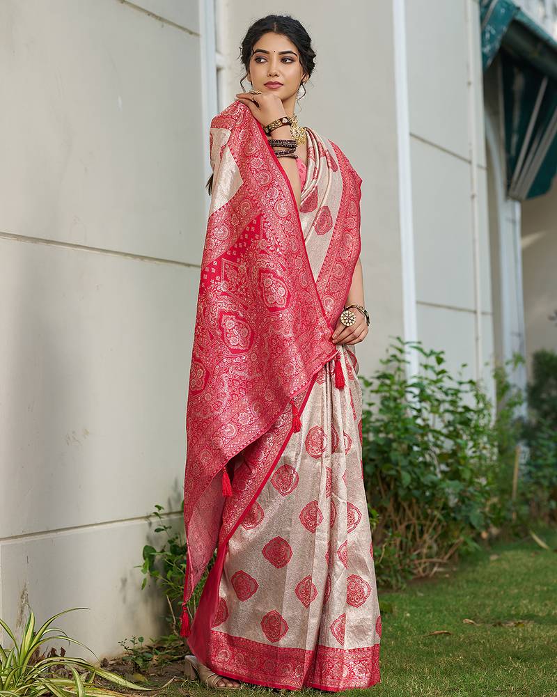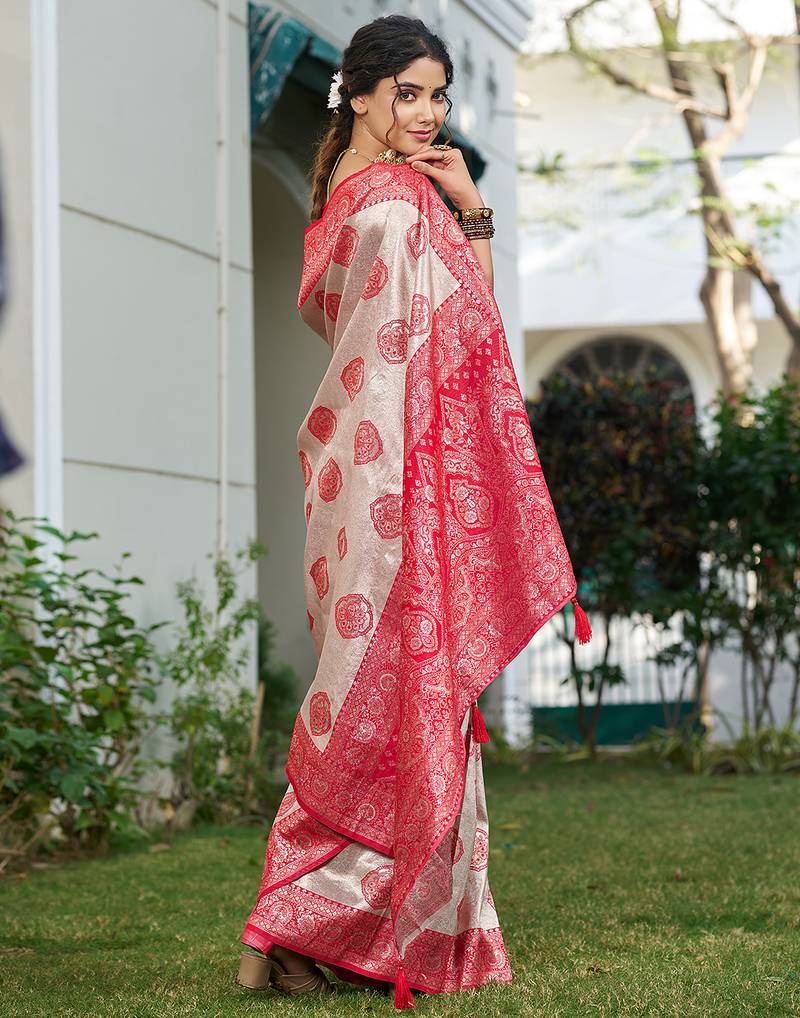 Coral silk blend woven saree with blouse