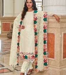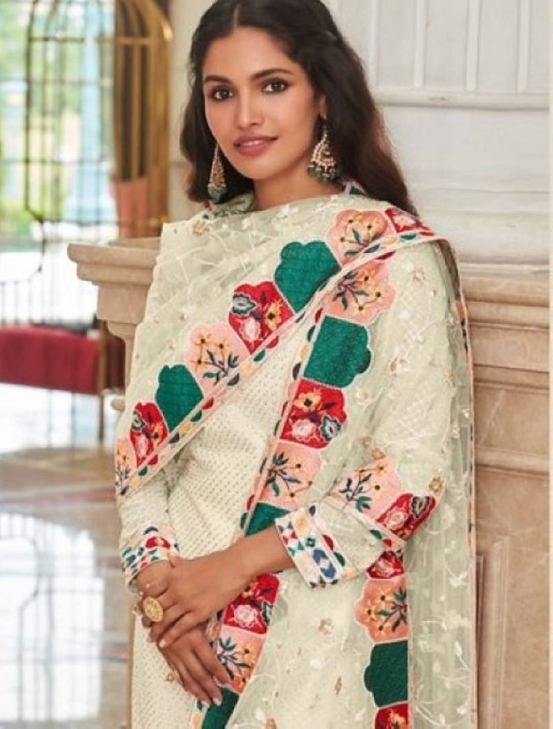 Cream faux georgette embroidered sequins & mirror work palazzo suit semi stitched