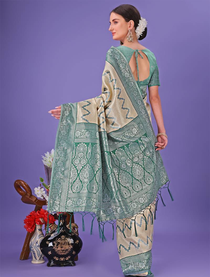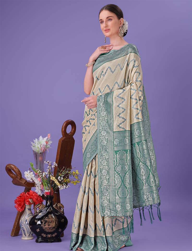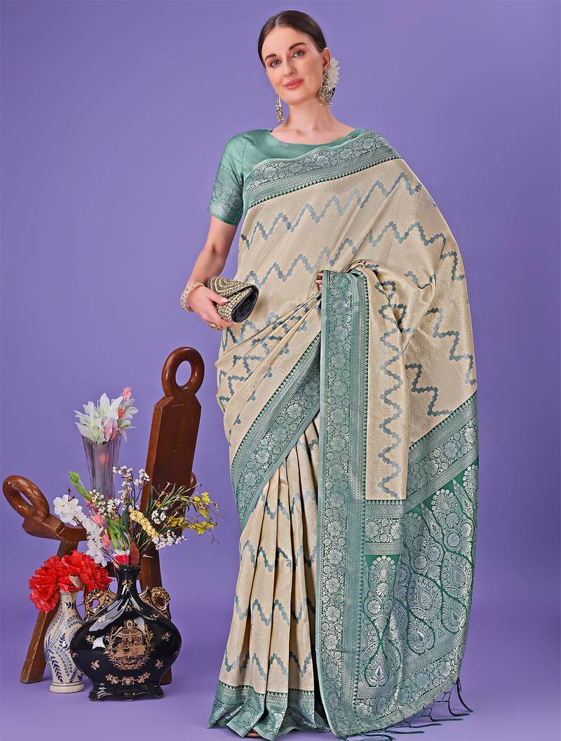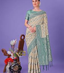 Cream lichi art silk with printed and zari weaving saree with blouse