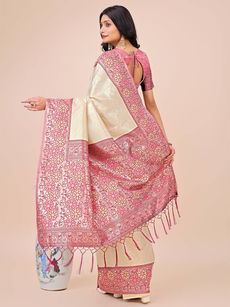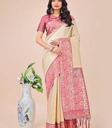 Cream lichi art silk with printed and zari weaving saree with blouse