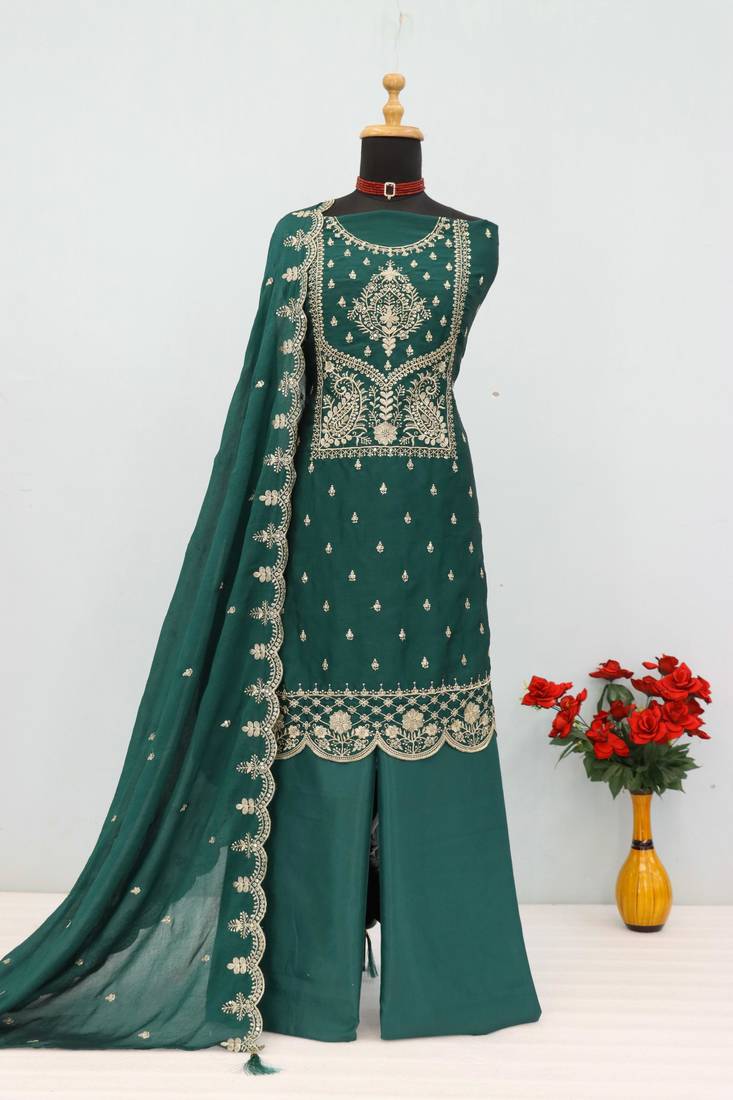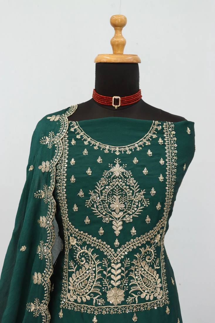 D green vichitra silk semi stitched suit with embroidery & sequence work